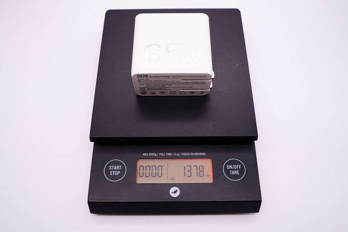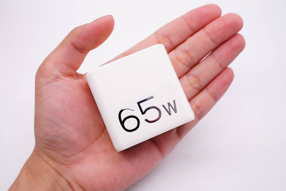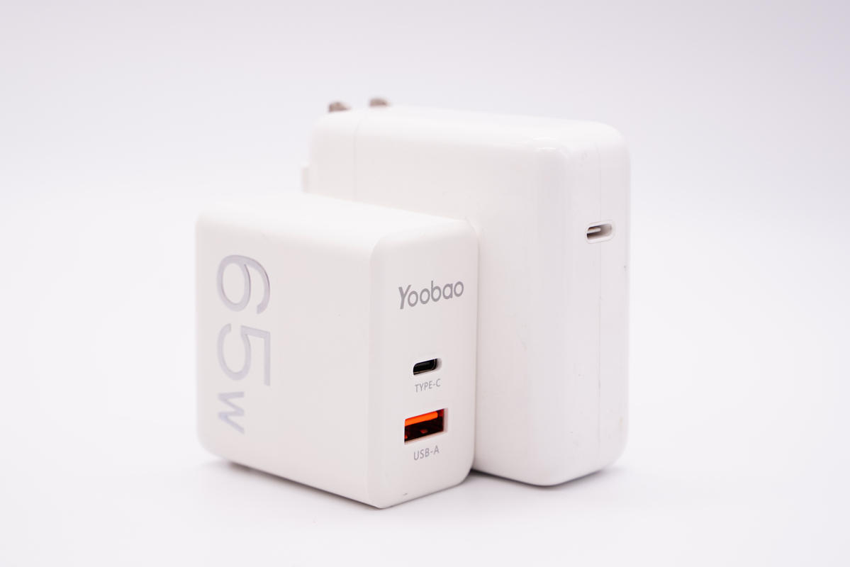 和蘋果61W充電器直觀對比,體積優(yōu)勢明顯。