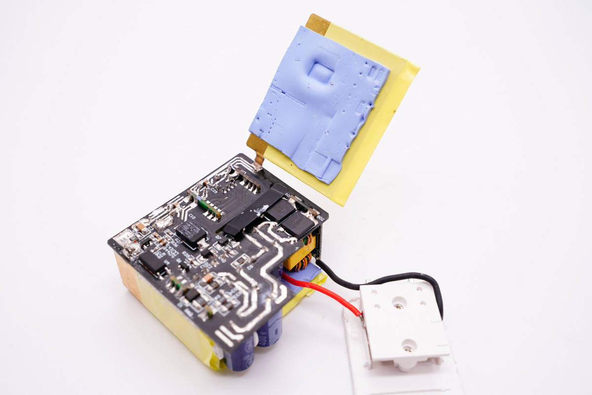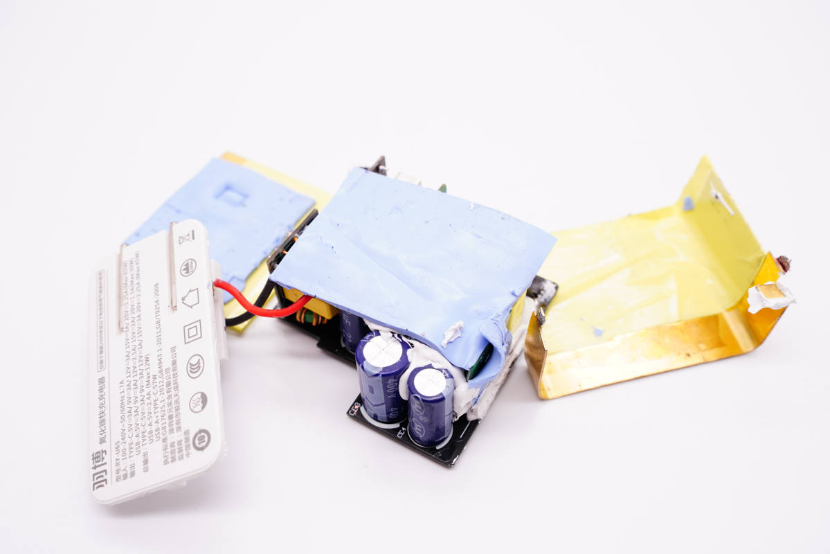 將輸入端外殼拆開取出充電器,插腳和PCB板使用導(dǎo)線連接通電。