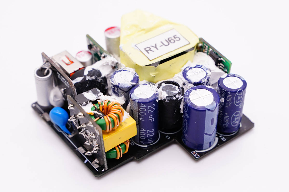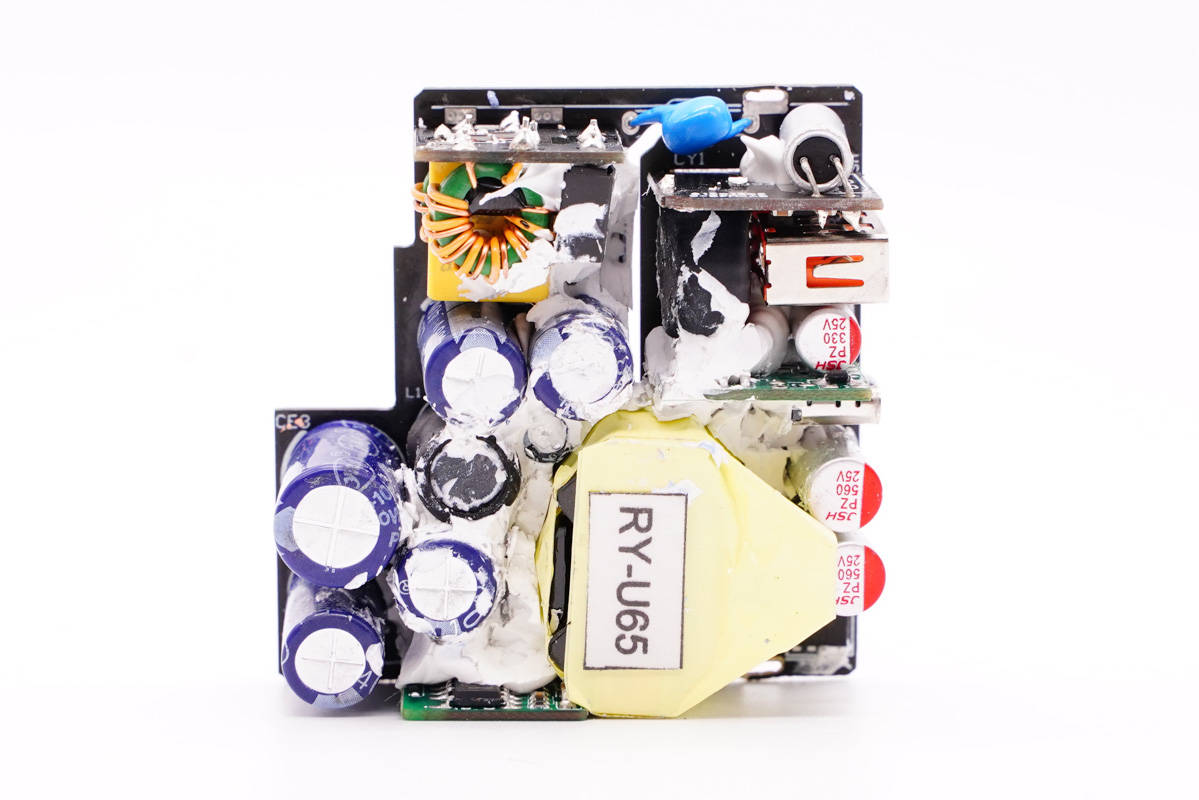 五顆高壓濾波電解電容均是深圳市昱光電子y.u.g品牌,其中四顆規(guī)格都是400V 22μF。該系列電容采用環(huán)保鉆石藍(lán)配色,工作溫度范圍:-40℃~105℃,3000小時壽命,具備抗雷擊、耐紋波、高頻低阻等優(yōu)勢,可以為快充優(yōu)化產(chǎn)品結(jié)構(gòu)、提升組裝工藝發(fā)揮作用。