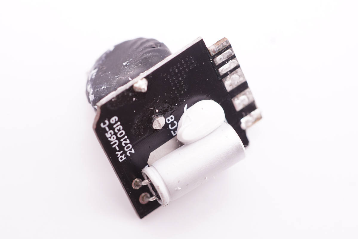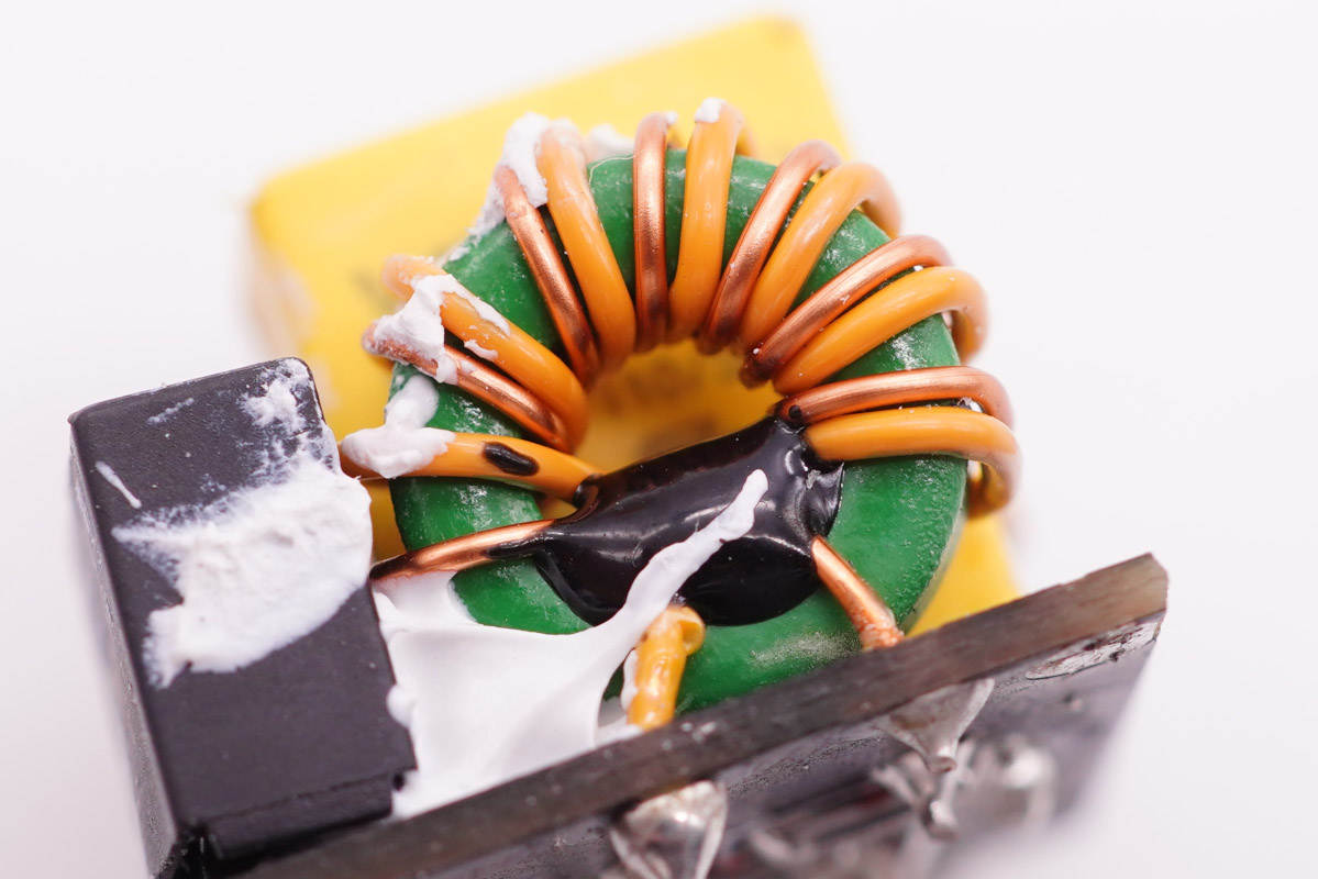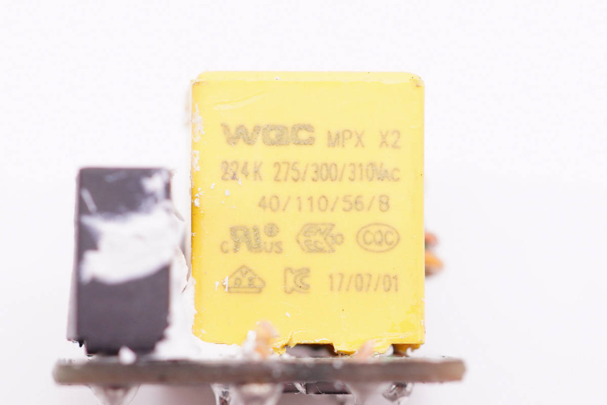 輸入端一覽,側(cè)面垂直焊接一塊小板,主板上設(shè)有五顆高壓濾波電解電容、工字電感和主控芯片供電電容。