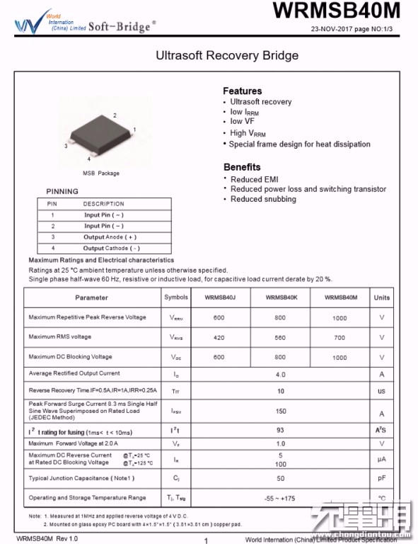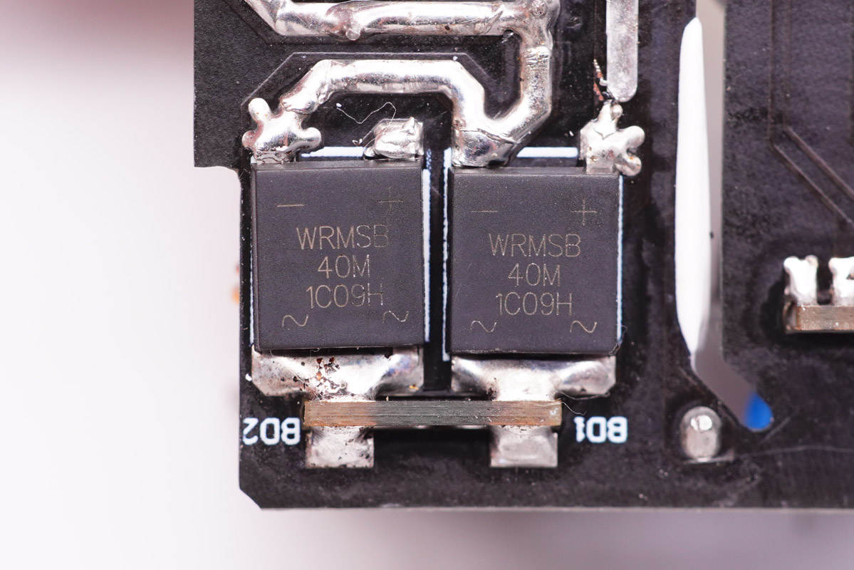 整流橋WRMSB40M來自深圳市沃爾德實(shí)業(yè)有限公司,設(shè)置兩顆是為了均攤發(fā)熱,降低溫升。這顆軟橋通過較軟的恢復(fù)曲線,比較平滑的關(guān)斷特性,可以降低二極管結(jié)電容達(dá)到非常少的諧波振蕩產(chǎn)生的效果。