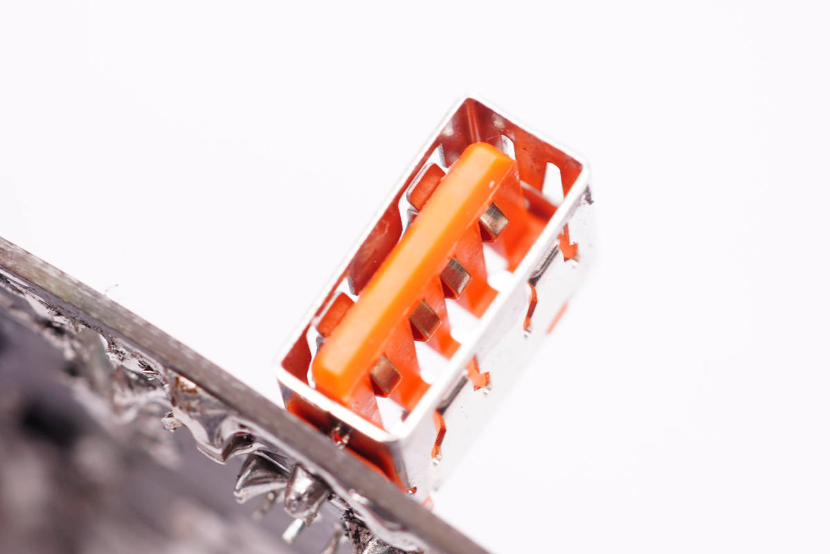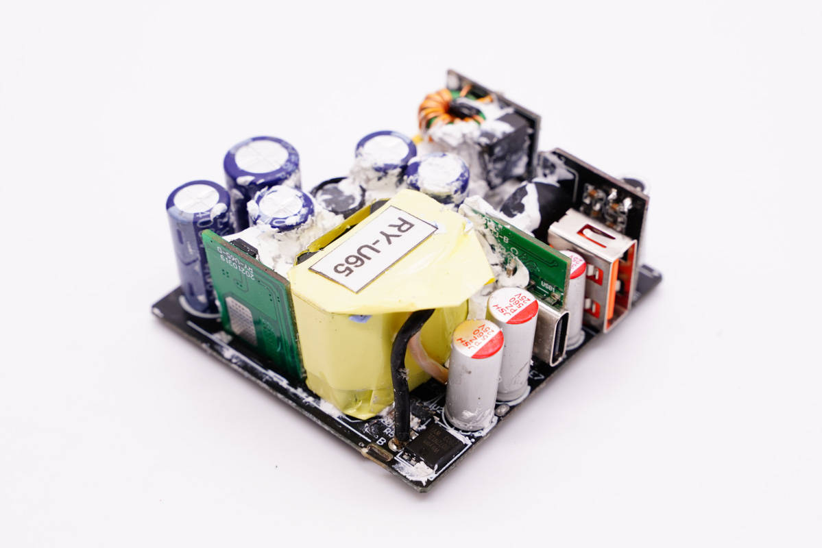 輸出端一覽,USB-C母座使用小板垂直焊接,USB母座直接焊接在主板上,兩個母座間有一顆固態(tài)電容,最右側(cè)還有一塊用于USB-A口的二次降壓小板。
