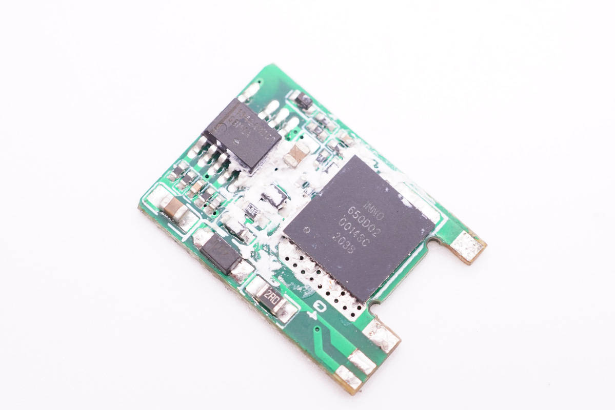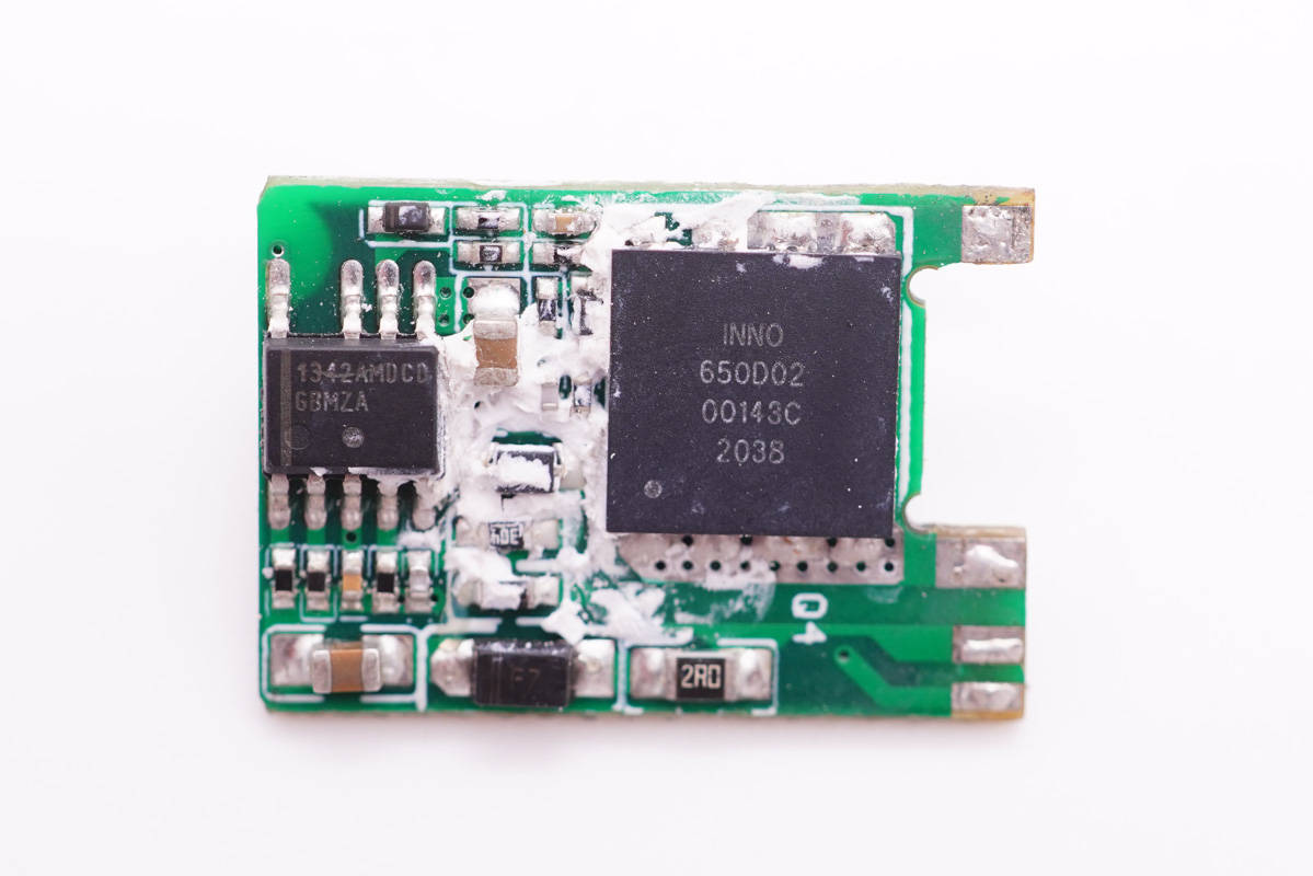 小板正面設(shè)有開關(guān)電源主控芯片和氮化鎵功率開關(guān)管。