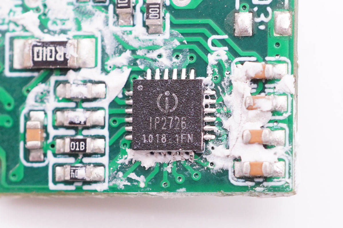 協(xié)議芯片采用英集芯IP2726,用于1A1C接口輸出電壓控制。這是一顆集成多種協(xié)議、用于USB輸出端口的快充IC,支持Type-C DFP、PD2.0/3.0、PPS、QC4+、QC2.0/3.0、FCP、AFC、SCP、MTK PE+、Apple2.4A、BC1.2以及三星2A等協(xié)議。具有高集成度和豐富的功能,在應(yīng)用時僅需極少的外圍器件,有效減小整體方案的尺寸,降低BOM成本。