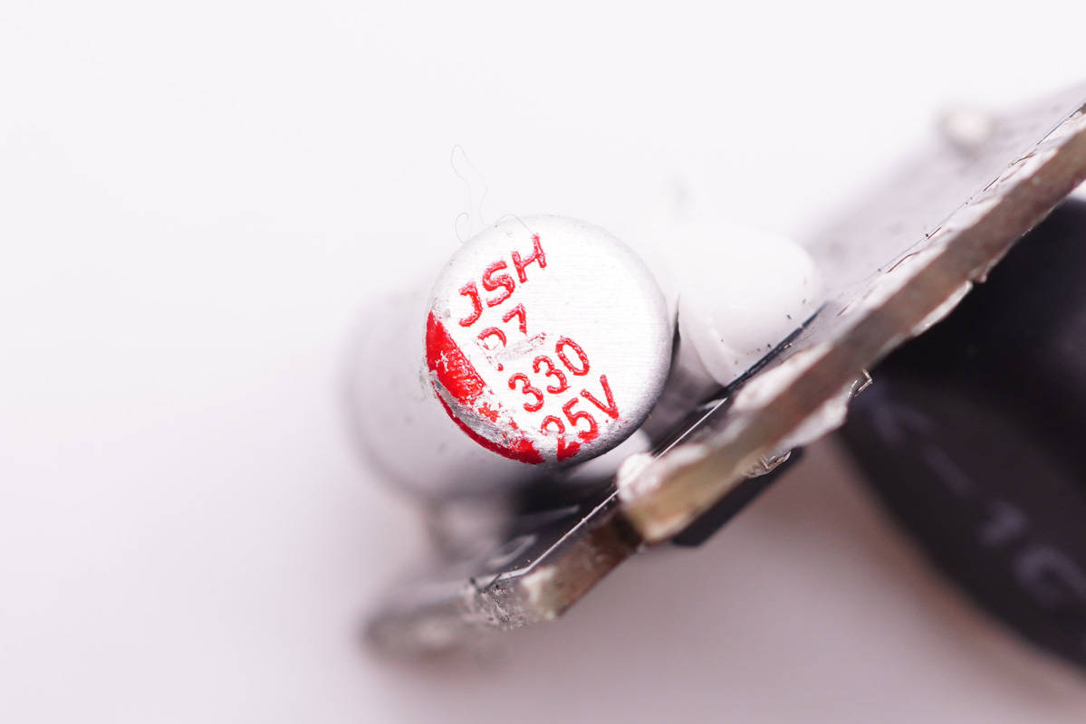 主板上的濾波固態(tài)電容特寫,同樣來自益陽萬京源,規(guī)格為25V 330μF。