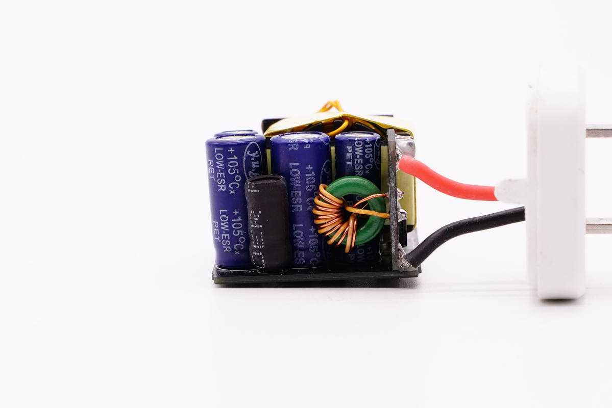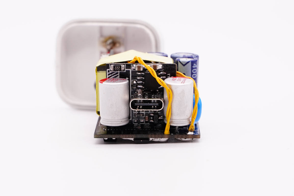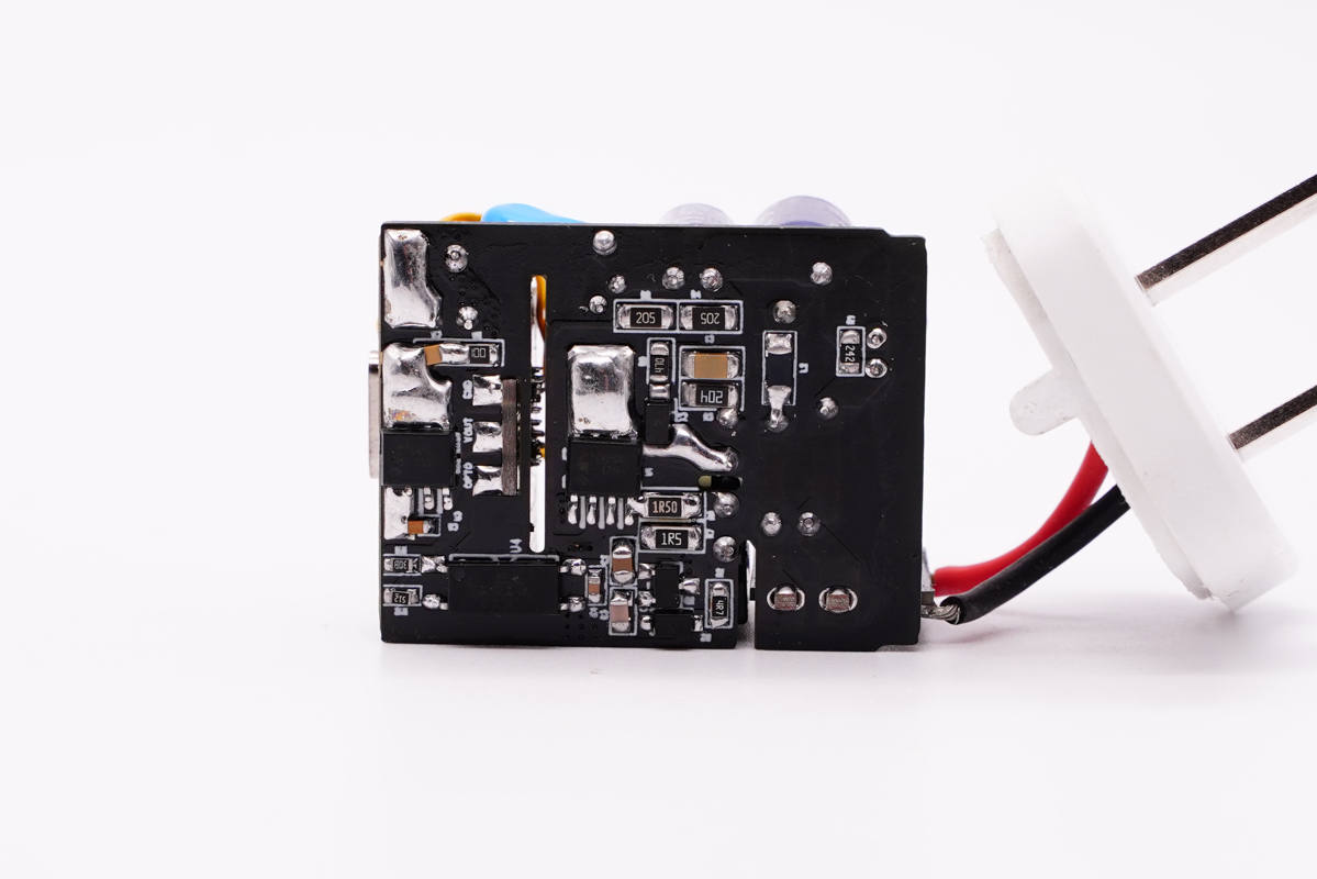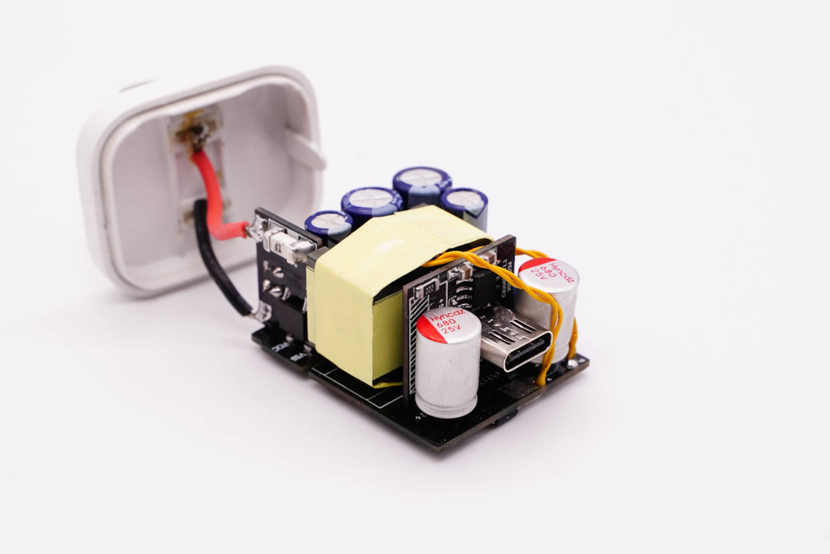 變壓器輸出采用多層絕緣線,輸出USB-C母座焊接在小板上再焊接到充電器電路板上。輸出采用兩顆固態電容濾波。