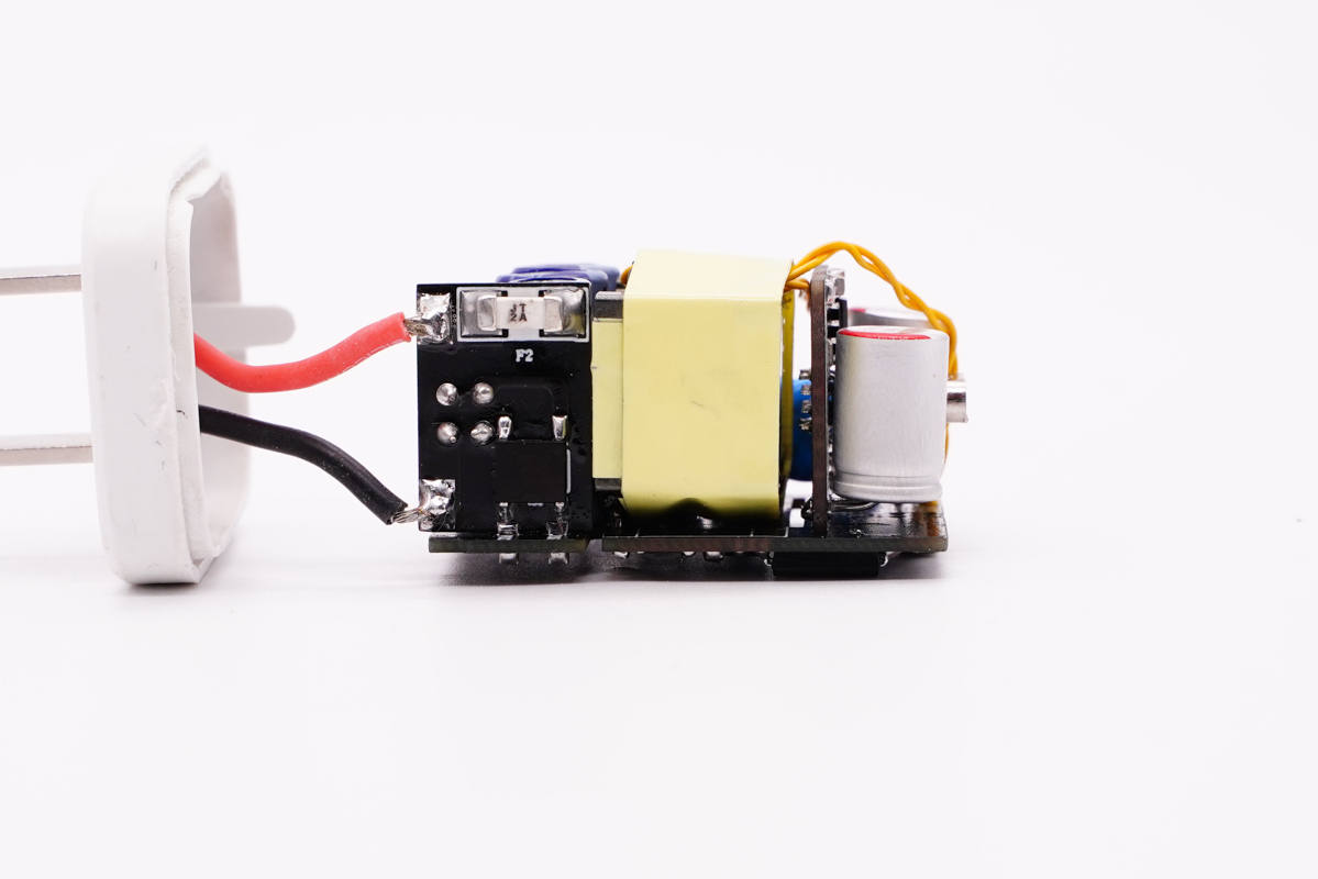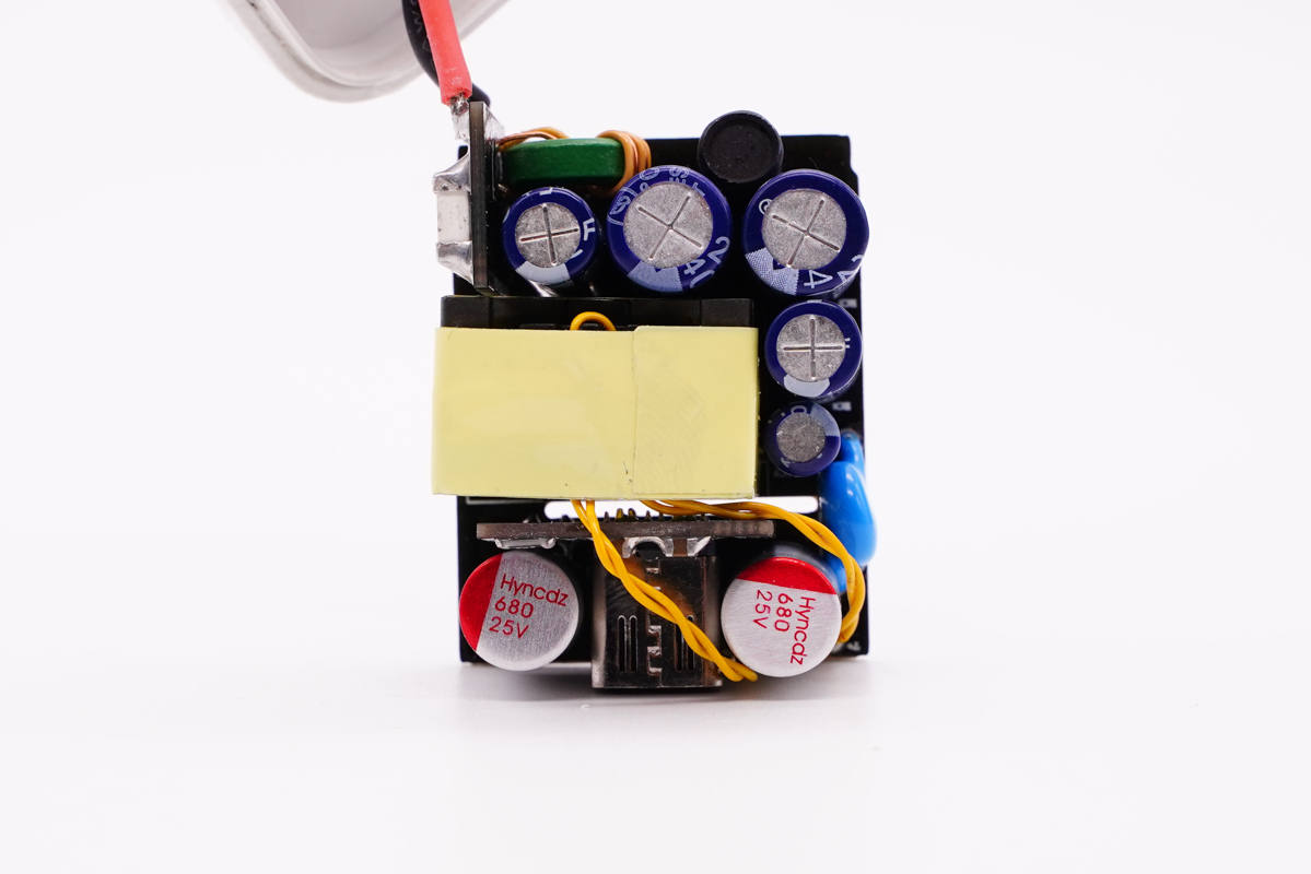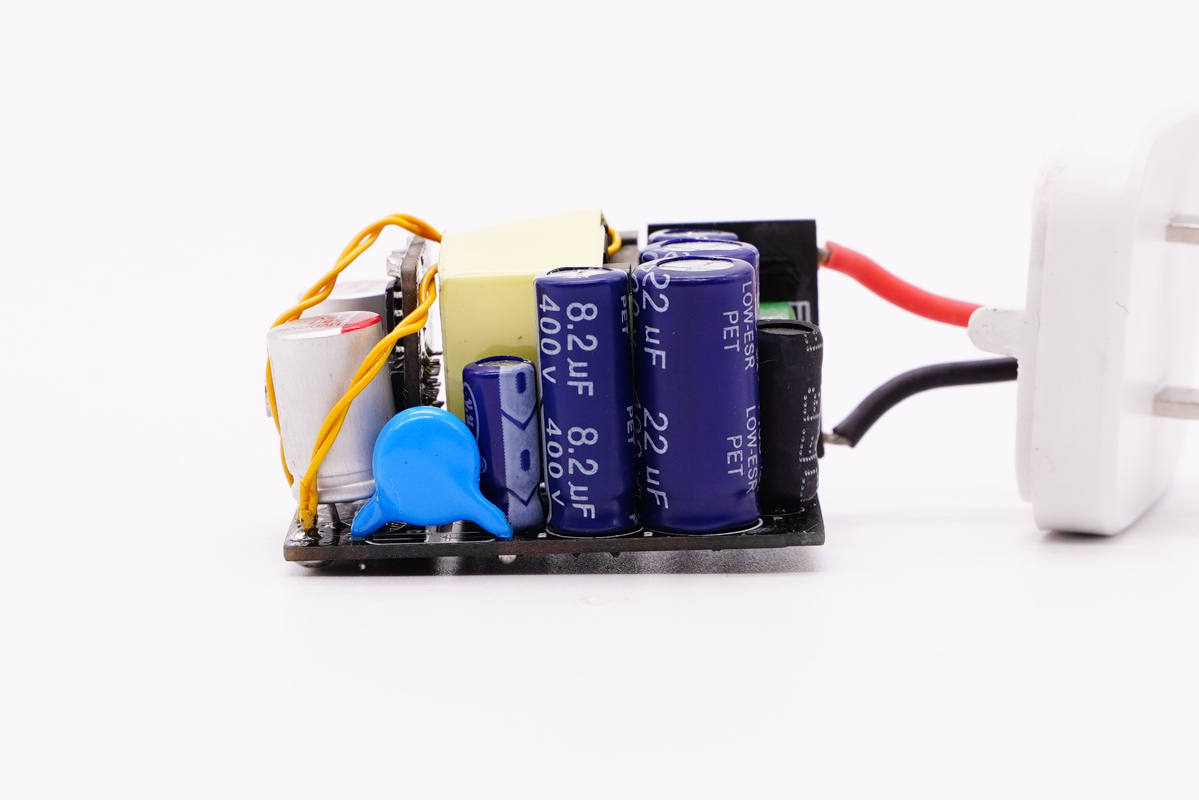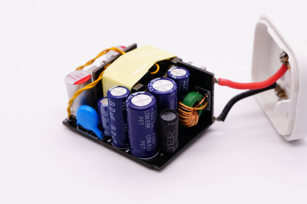 變壓器輸出采用多層絕緣線,輸出USB-C母座焊接在小板上再焊接到充電器電路板上。輸出采用兩顆固態電容濾波。