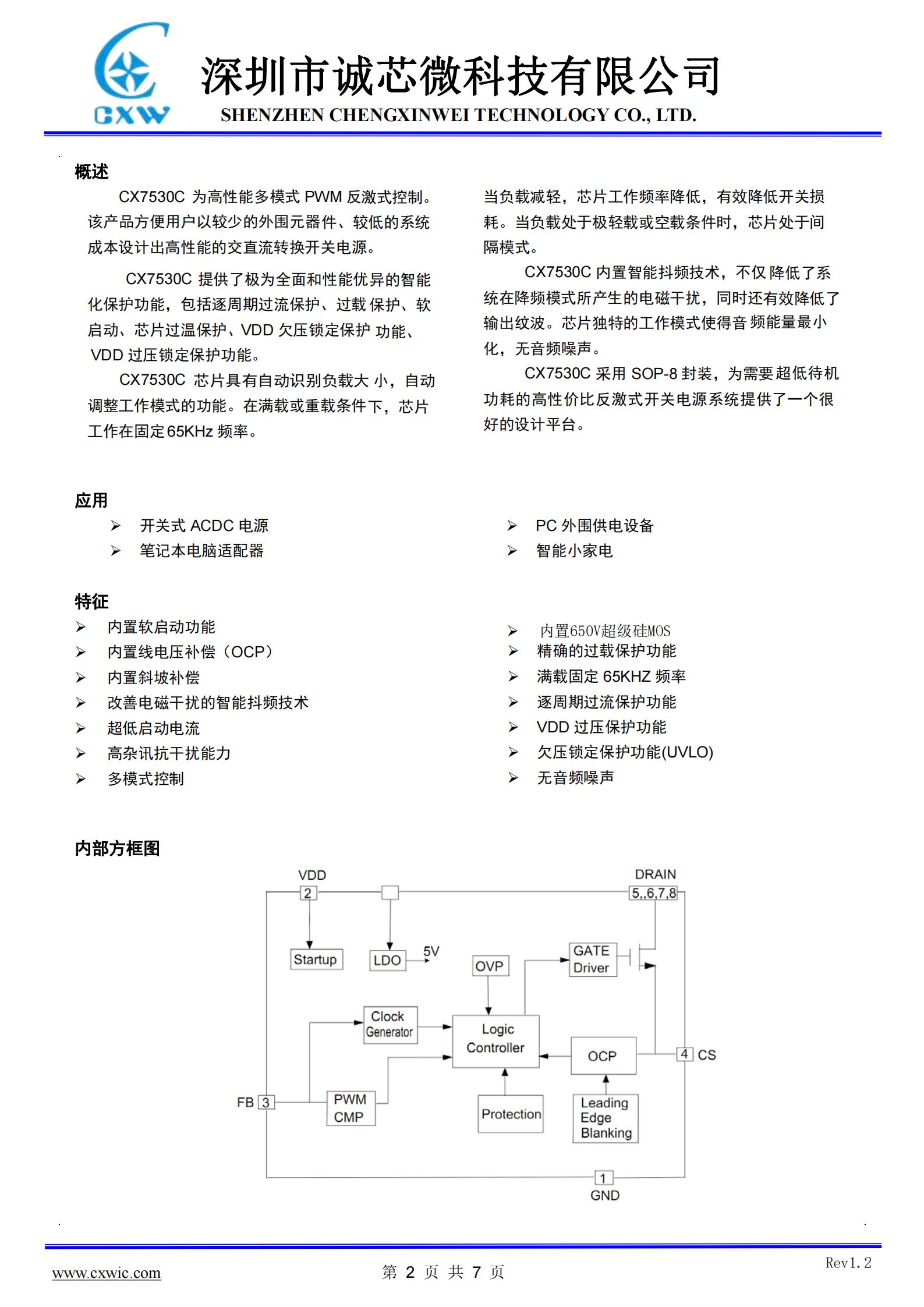 誠芯微CX7530C支持極為全面和性能優秀的智能化保護功能,包括逐周期過流保護,過載保護,軟啟動,芯片過熱保護,供電欠壓過壓保護功能,芯片無音頻噪音運行。采用SOP8封裝,適用于PD快充適配器和智能小家電等小功率高可靠性開關電源。