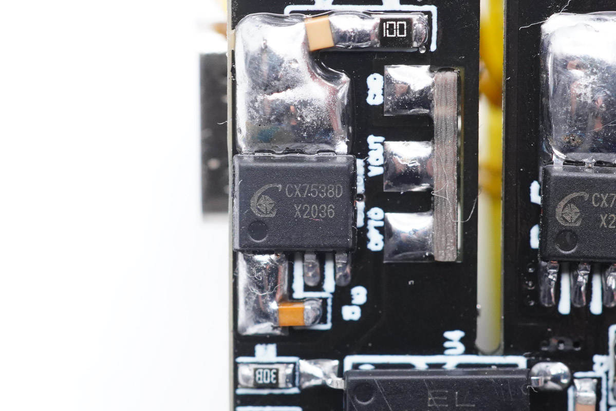 次級采用內部集成同步整流管的多模式同步整流器CX7538D,其內部集成100V耐壓,導阻10mΩ的高性能同步整流管,支持CCM/QR/DCM工作模式,最高支持200KHz工作頻率,靜態電流低,相比傳統肖特基整流方式可提高2-6%效率,支持3A輸出電流。CX7538D漏極大面積露銅加錫,輔助散熱。