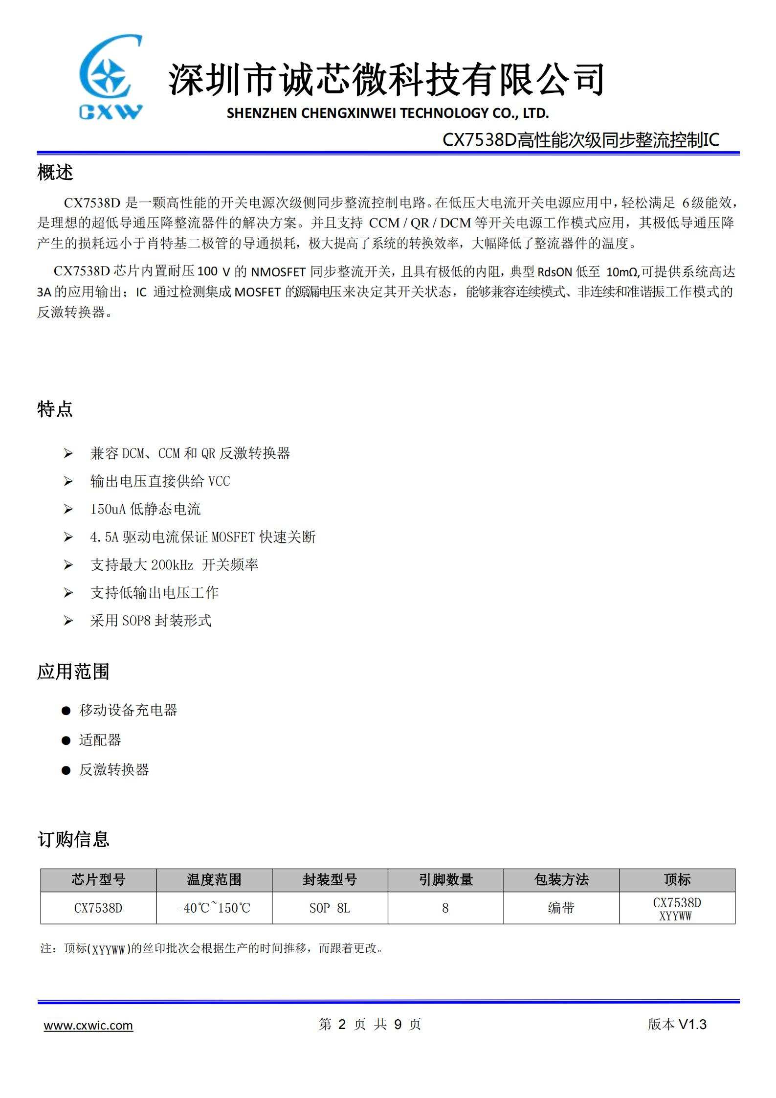 誠芯微CX7538D支持5V3A、9V3A、12V3A、15V3A、20V3A輸出,外圍元件非常精簡,電壓支持范圍寬,適用于60W以下的適配器應用,輕松滿足6級能效要求。