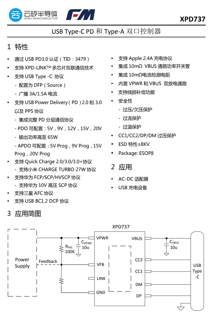 富滿云矽XPD737采用ESOP8封裝,內部集成 10mΩ VBUS 通路功率開關管,并且集成10mΩ電流檢測電阻,支持USB PD以及PPS,QC3.0/2.0協議,華為SCP/FCP快充協議,三星AFC快充協議,引腳支持過壓保護,工業級8KV ESD特性,適用于PD快充和移動電源,車充等應用。XPD737內置完善的保護功能,外圍精簡。