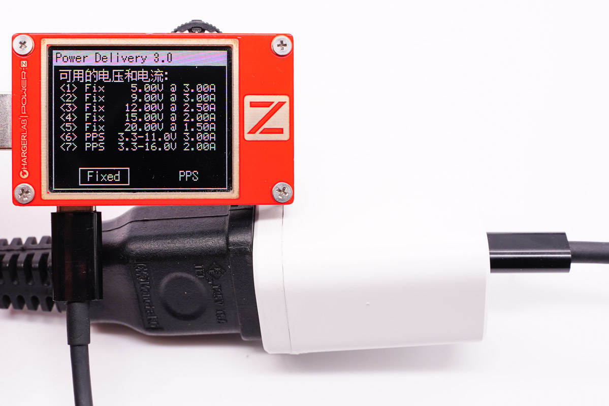 使用POWER-Z KT002讀取充電器的PDO報文,實測支持5V3A、9V3A、12V2.5A、15V2A、20V1.5A五個固定PD輸出檔位,額外還支持3.3-11V3A和3.3-16V2A兩組PPS檔位。