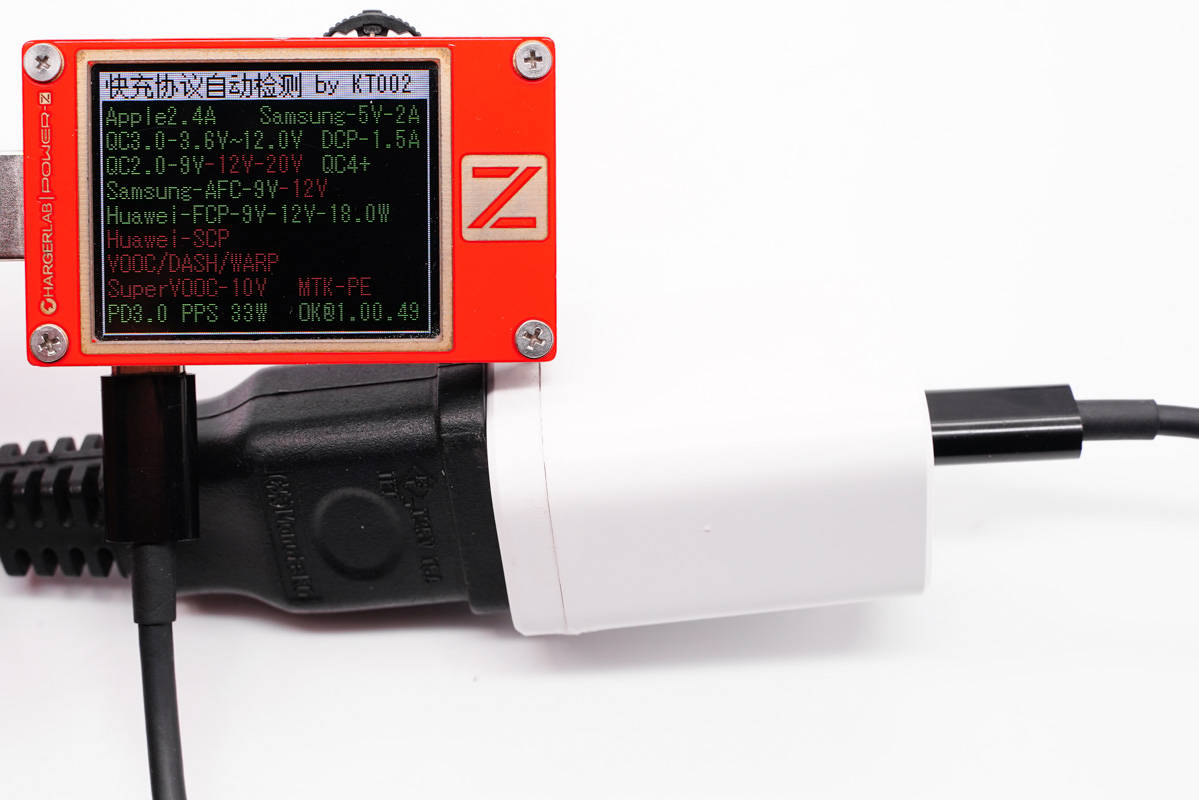 使用POWER-Z KT002讀取充電器的快充協議,實測支持PD、PPS、Apple2.4A、QC2.0、QC3.0、QC4+、AFC、FCP快充協議。