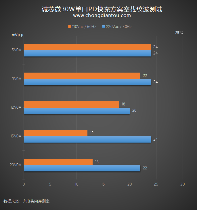 誠芯微這款30W單口PD方案在220Vac輸入下紋波非常低,最高僅44mV,最高紋波出現在110Vac輸入20V1.5A輸出下,為65mV。
