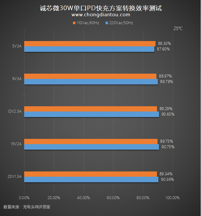 我們通過110Vac/60Hz和220Vac/50Hz模擬110V和220V環境,將誠芯微30W快充方案在各個電壓檔位進行滿載測試,實測220V下這款方案的轉換效率超過了90%,110V下效率也接近了90%,