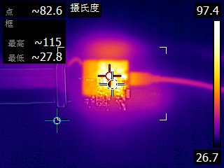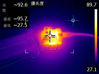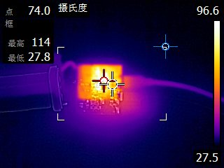 充電頭網對誠芯微30W單口PD快充方案進行溫升測試,在25℃恒溫箱中以9V3A和20V1.5A持續輸出一小時,測試溫升數據。采用FLIR E4紅外熱像儀進行溫度測試。