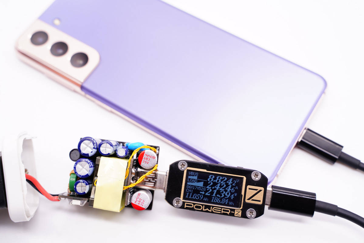 為三星S21充電,電壓8.82V,電流2.42A,充電功率約為21.4W。