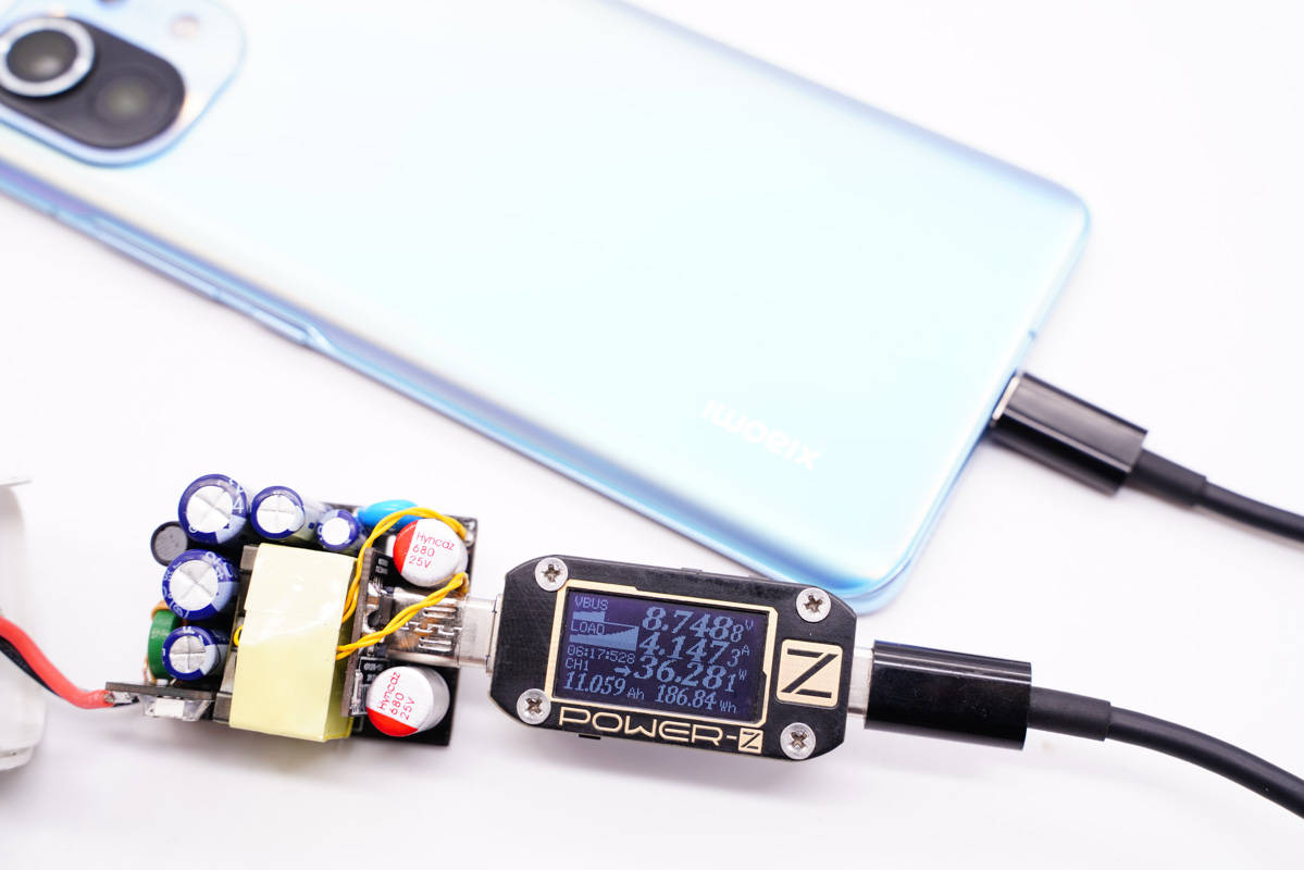 為小米11充電,電壓8.75V,電流4.15A,充電功率約為36.3W。