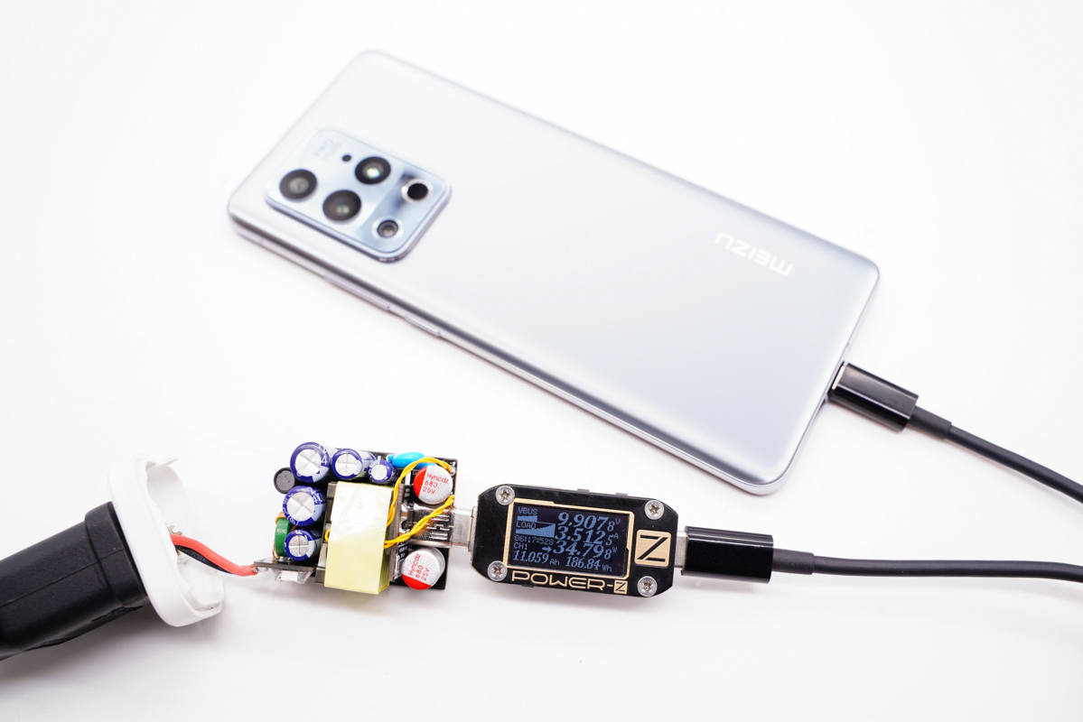 為魅族18Pro充電,電壓9.9V,電流3.51A,充電功率約為34.8W。