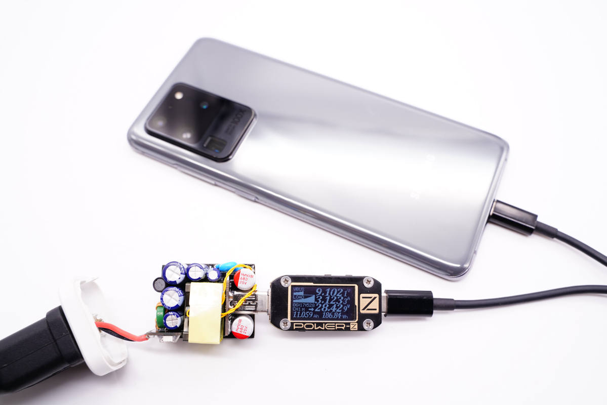 為三星S20U充電,電壓9.1V,電流3.12A,充電功率約為28.43W。