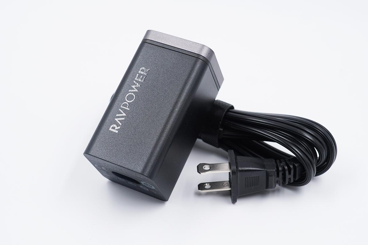 包裝盒采用藍白配色,印有RAVPOWER品牌和充電器名稱,中間是大大的R藝術(shù)字。