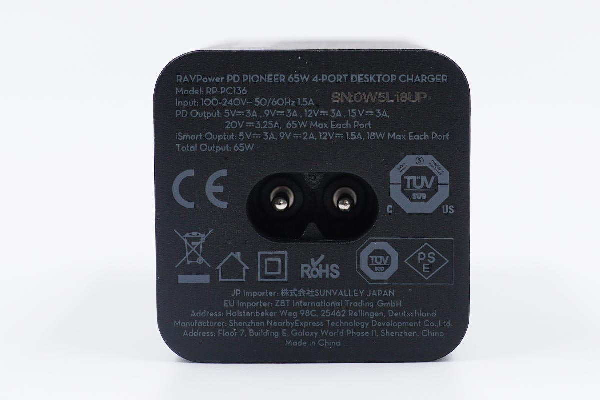 輸入端采用8字接口,外殼上印有充電器參數(shù)和認證信息