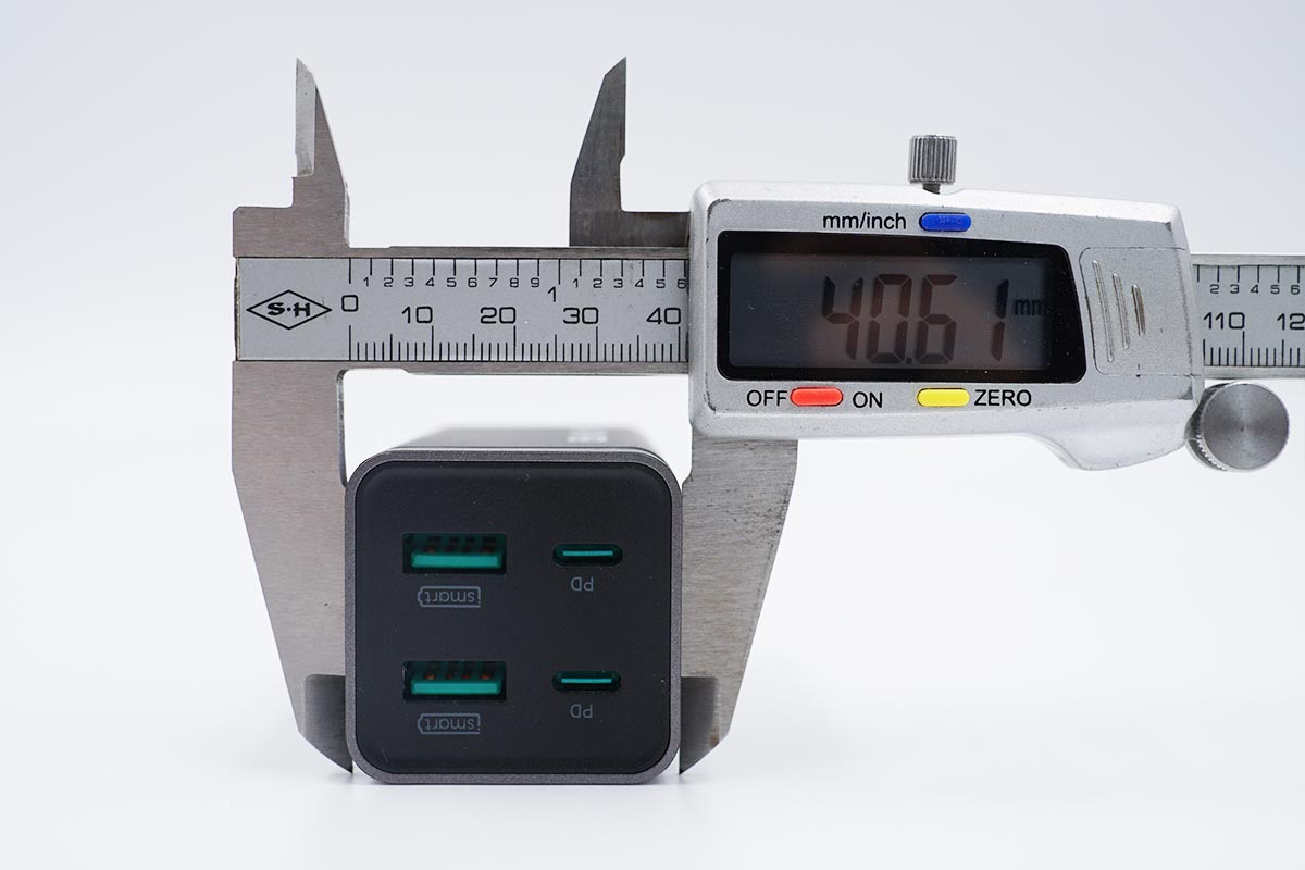 使用游標卡尺實測充電器機身長度為75.09mm。