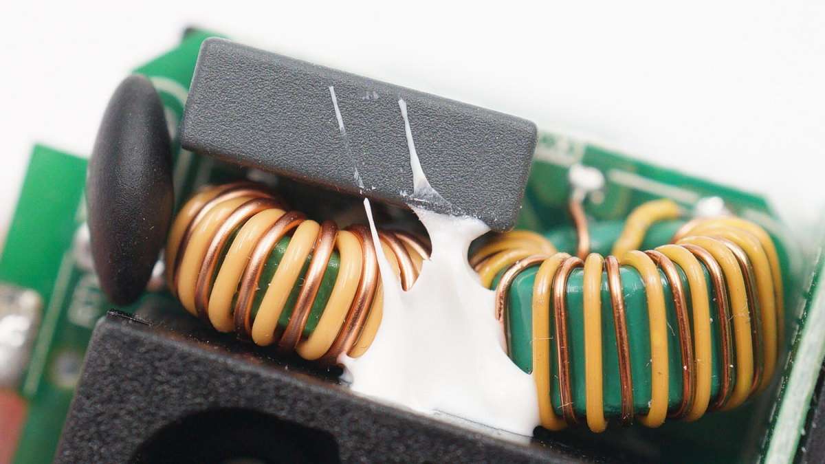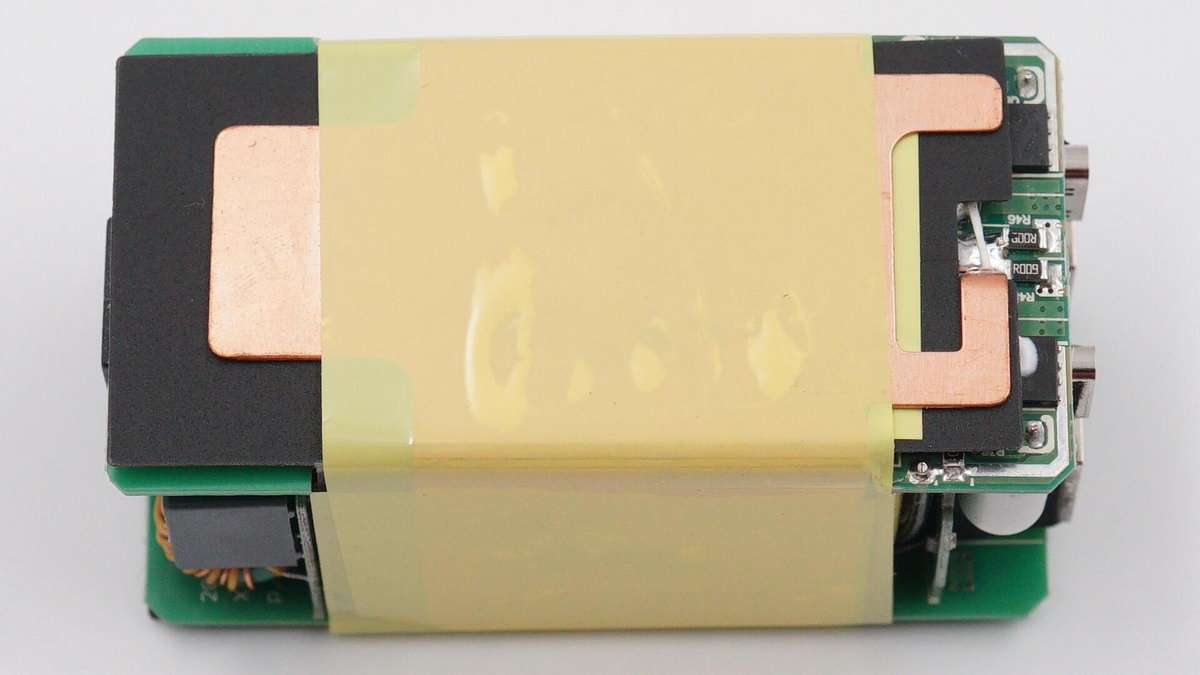 充電器模塊覆蓋U型銅片幫助散熱,同時粘貼膠帶和焊接固定,另外設有塑料板進行隔離。