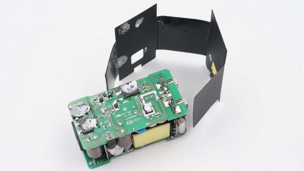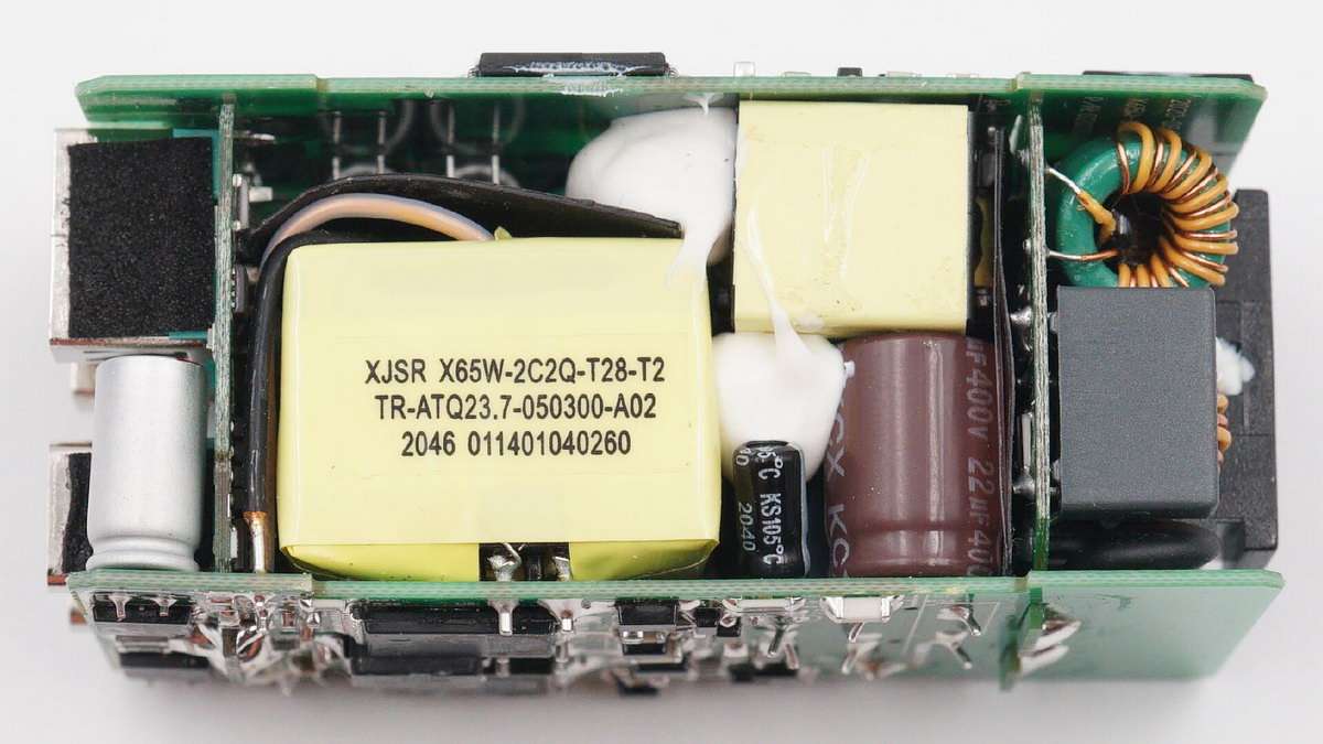 另一塊長方形電路板上設有一顆PI主控芯片和同步整流管。因此這款充電器總共設有三路開關電源電路,兩個USB-C口各一路,兩個USB-A口共用一路。