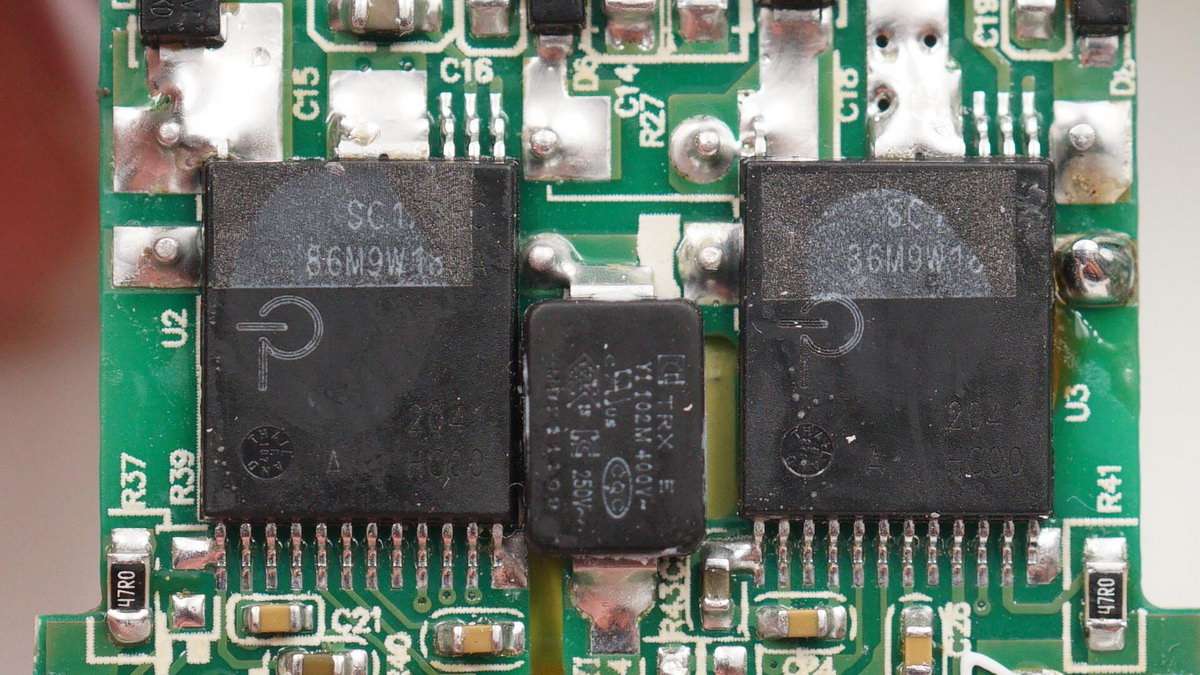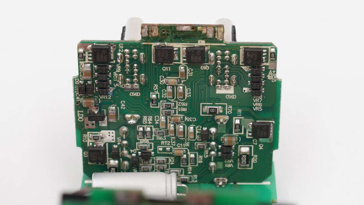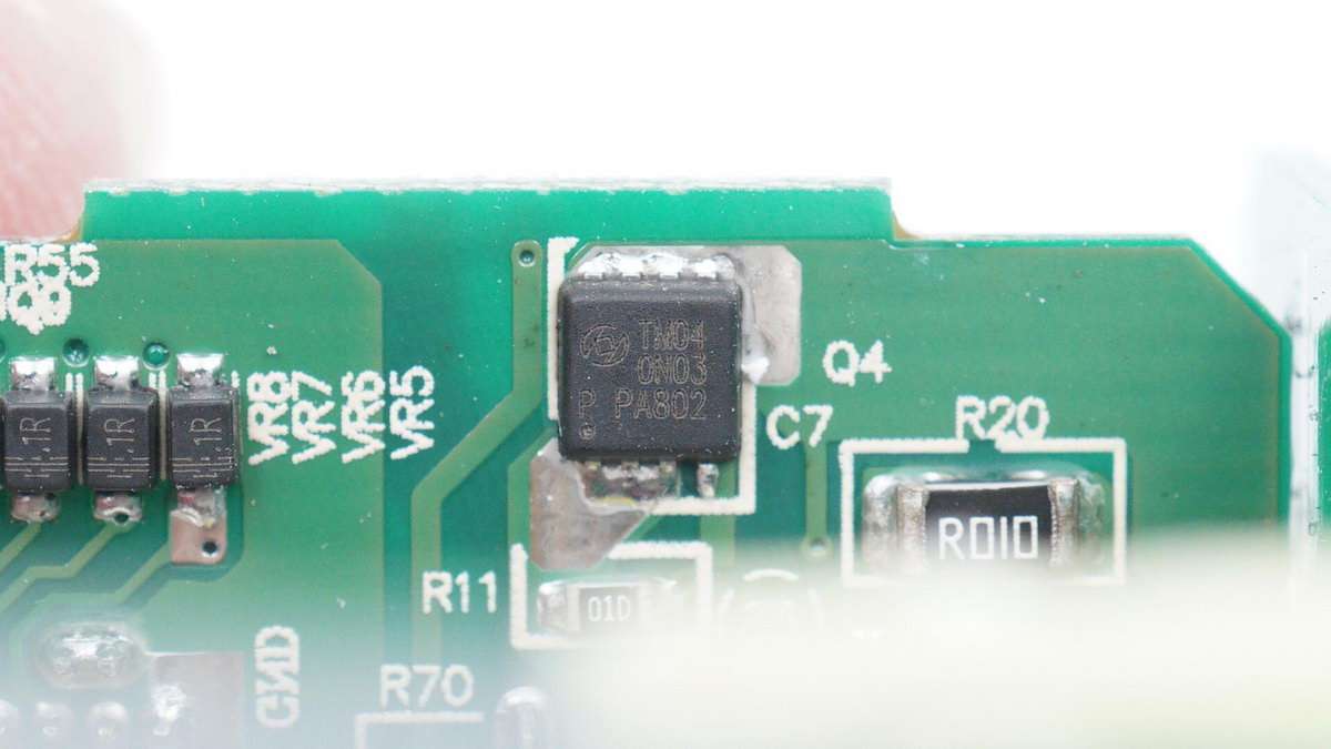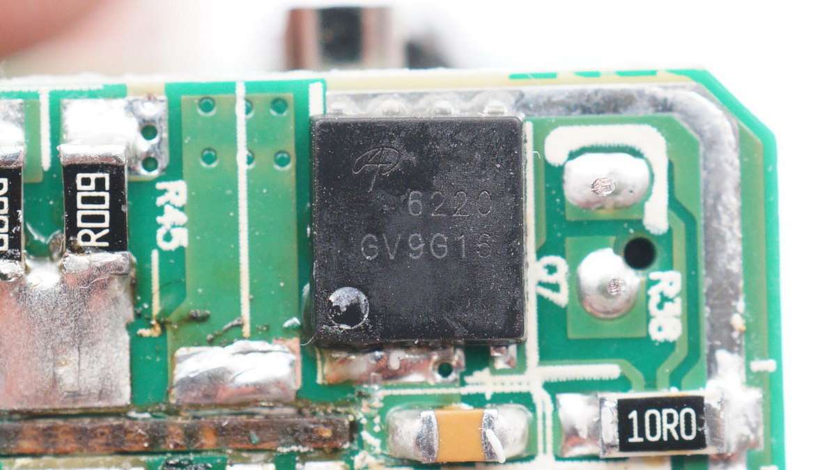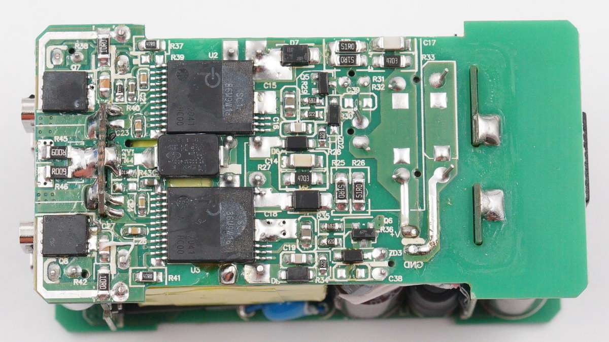 輸出端小板背面設有四顆相同的MOS管,用于兩路輸出并聯(lián)實現(xiàn)單口65W輸出或單口獨立輸出,下方MOS管和取樣電阻用于USB-A口輸出。