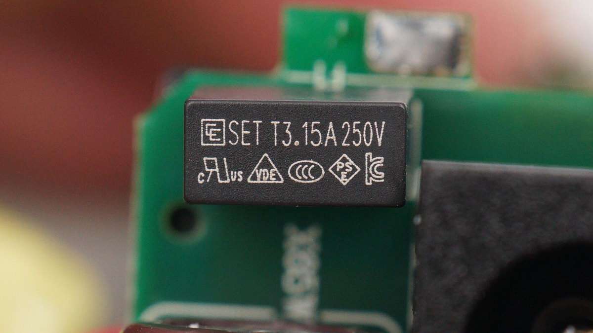 延時保險絲特寫,規(guī)格為3.15A 250V。