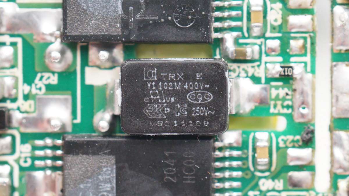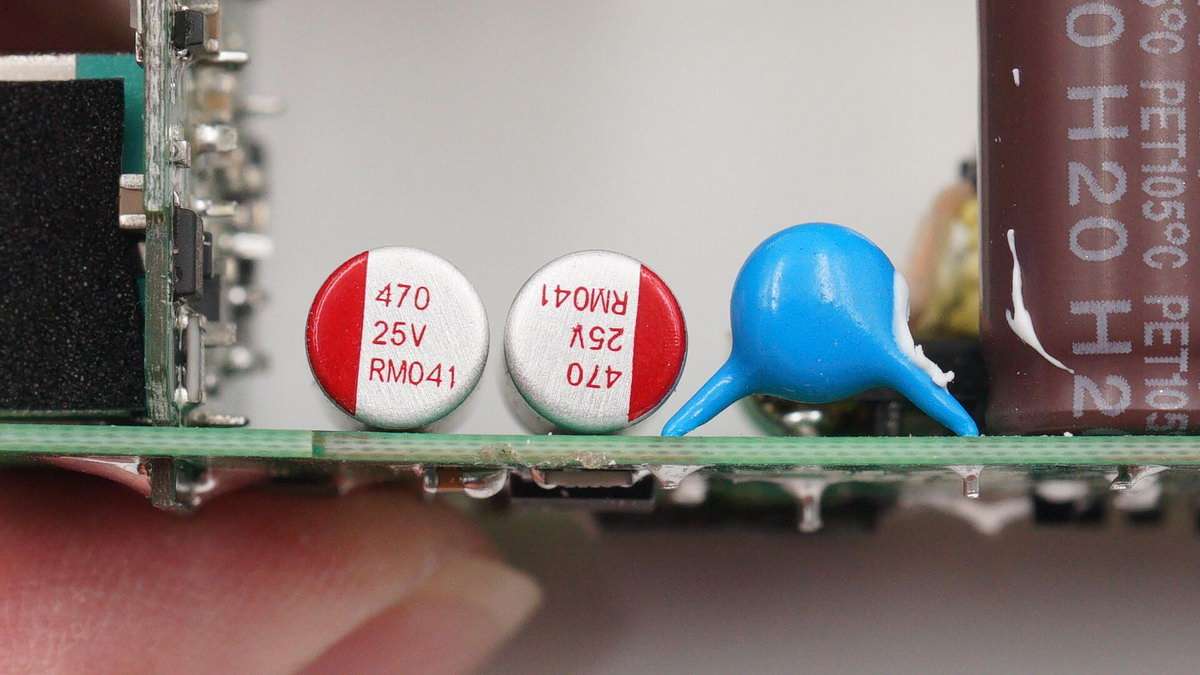 藍色Y電容以及兩顆輸出濾波固態(tài)電容,規(guī)格均為25V 470μF。