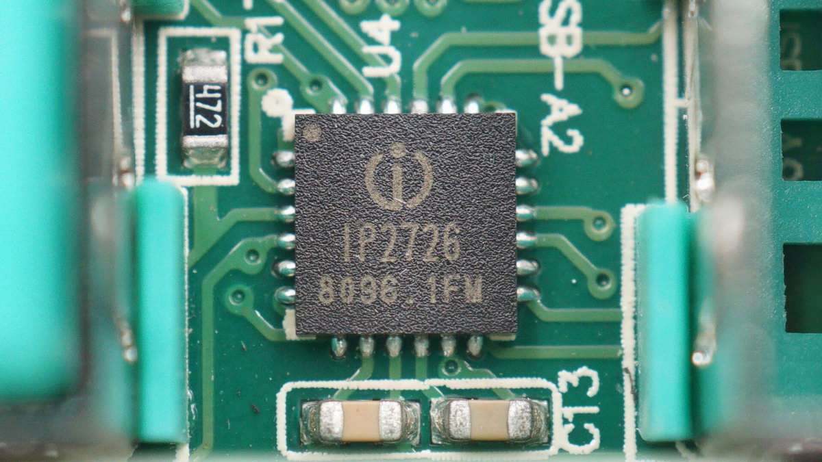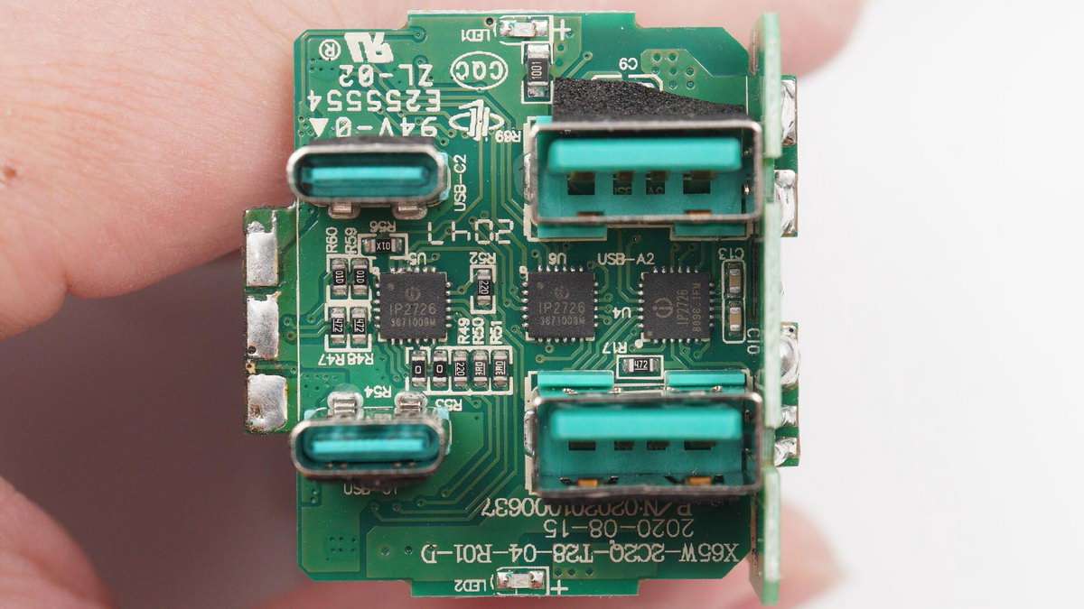 正面三顆協(xié)議芯片均為英集芯IP2726,左中兩顆用于兩個USB-C口協(xié)議識別,右側(cè)一顆用于兩個A口的協(xié)議識別。