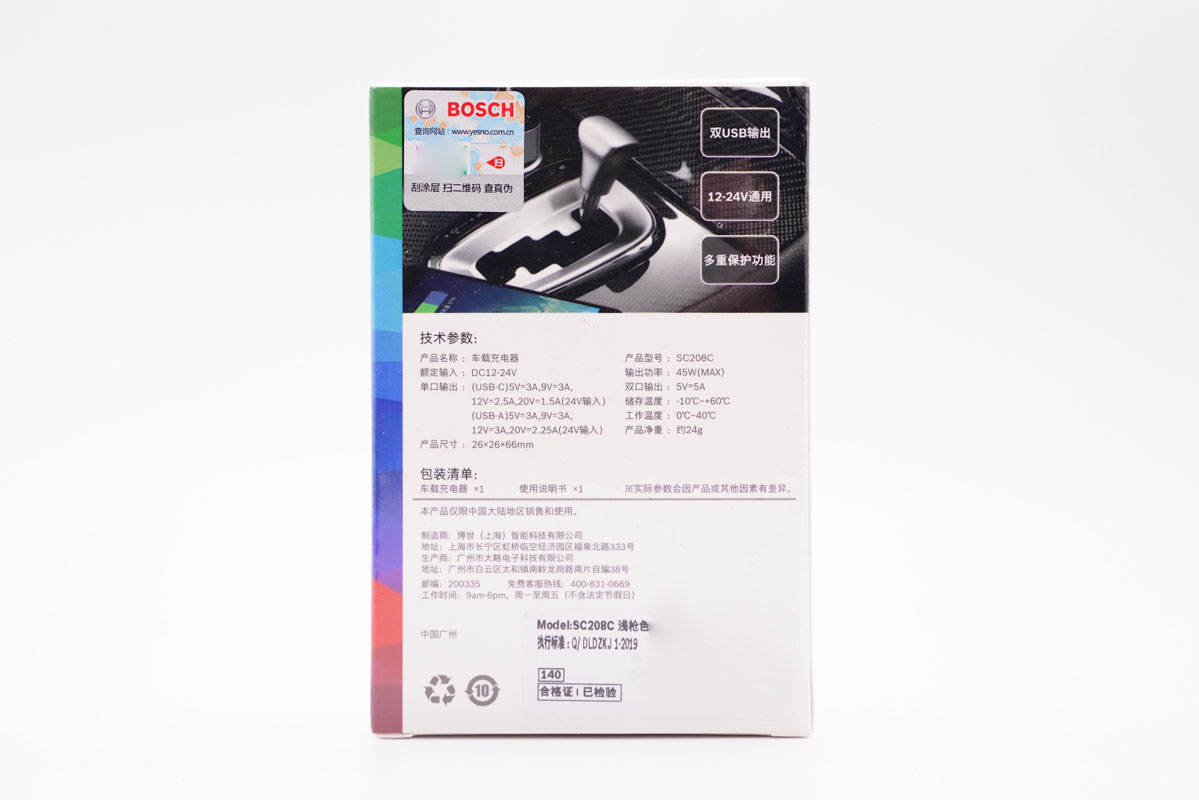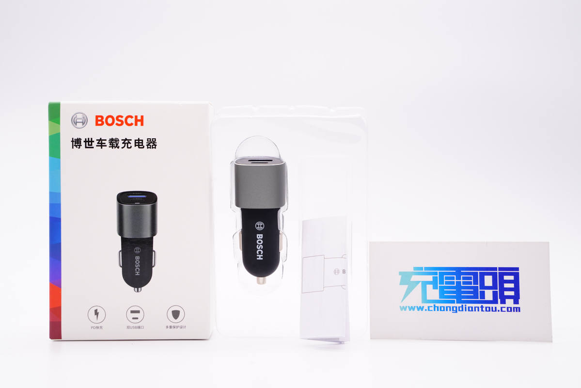 包裝盒正面印有BOSCH品牌、博世車載充電器名稱、車充外觀圖以及三大特性標識。