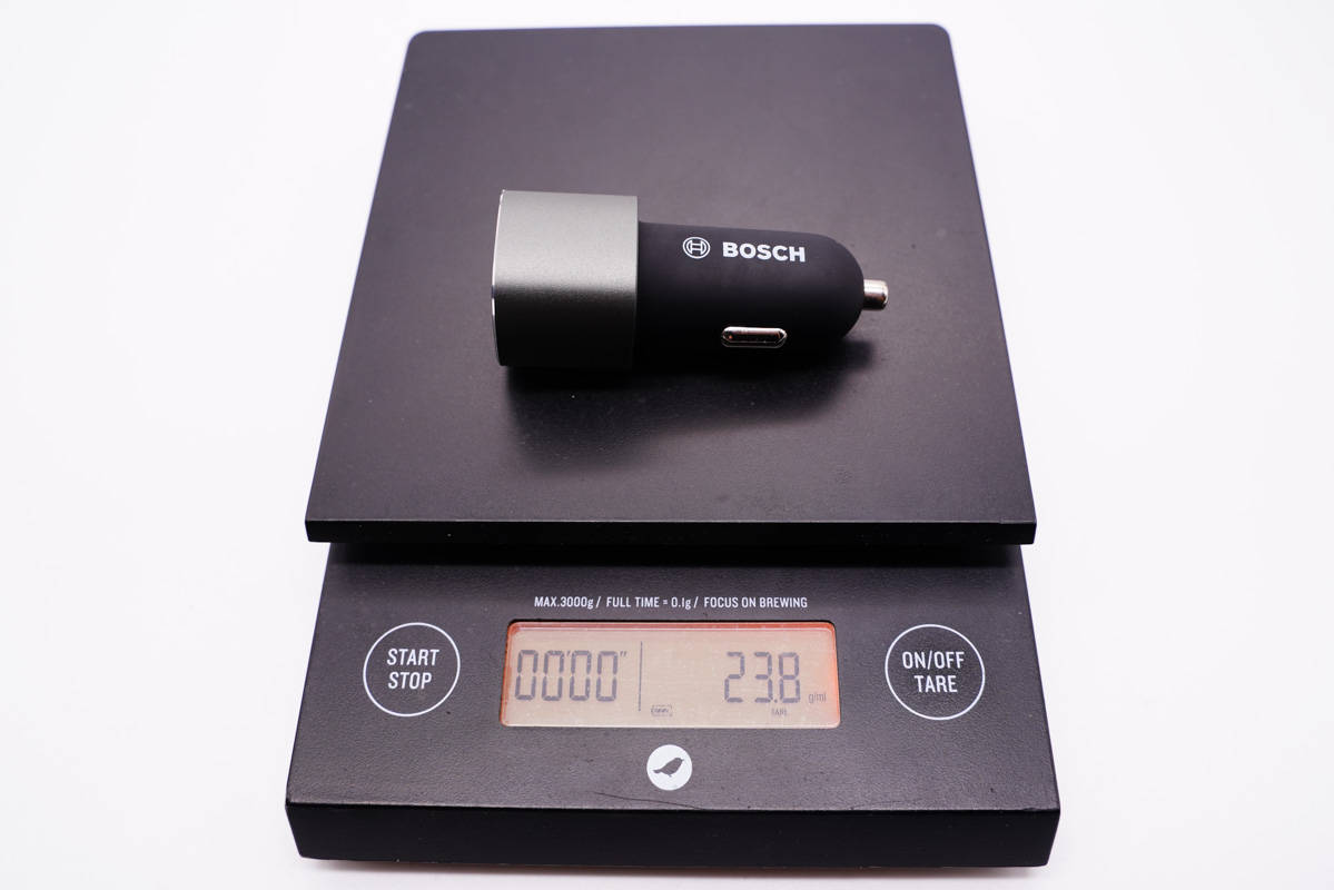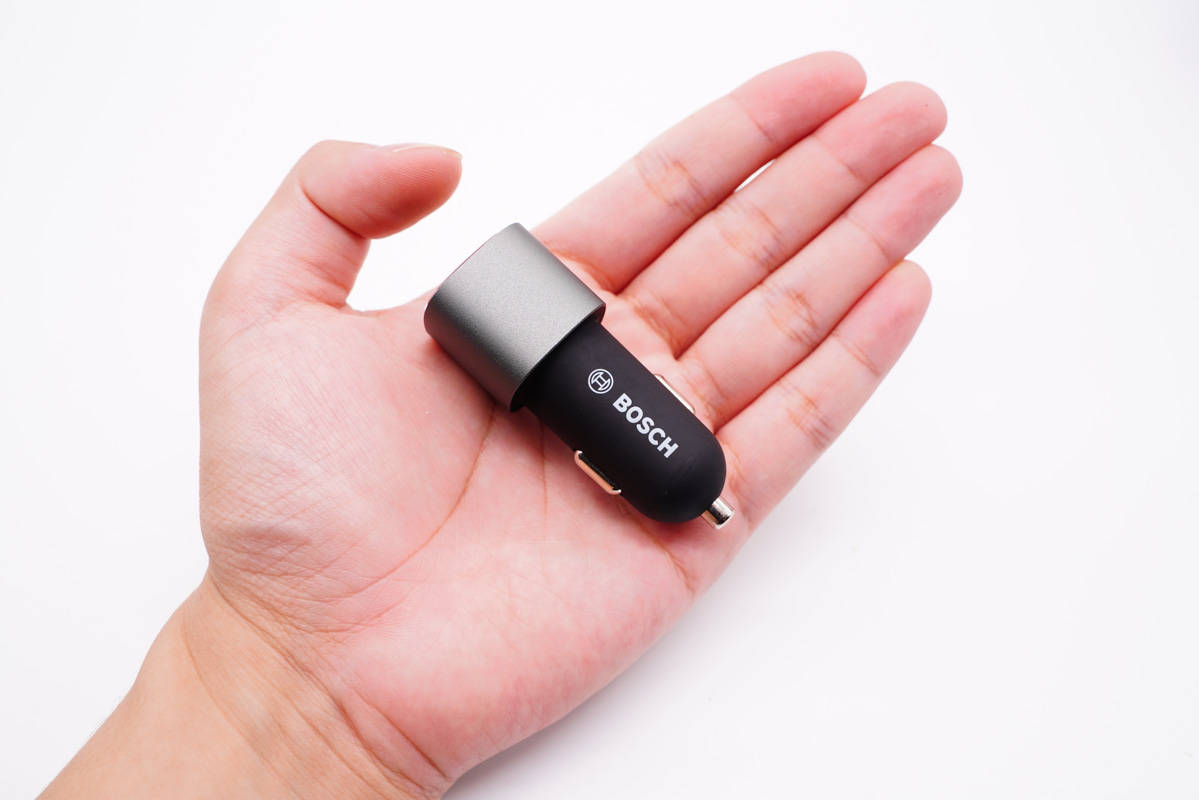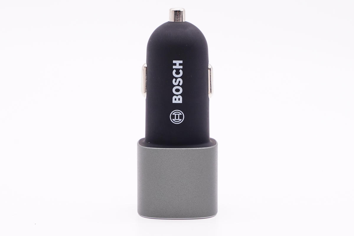車充采用PC阻燃材質黑色外殼,表面光滑且具有類膚手感,正面印有BOSCH品牌logo。機身頭部還套有一個灰色金屬殼,表面噴砂處理。