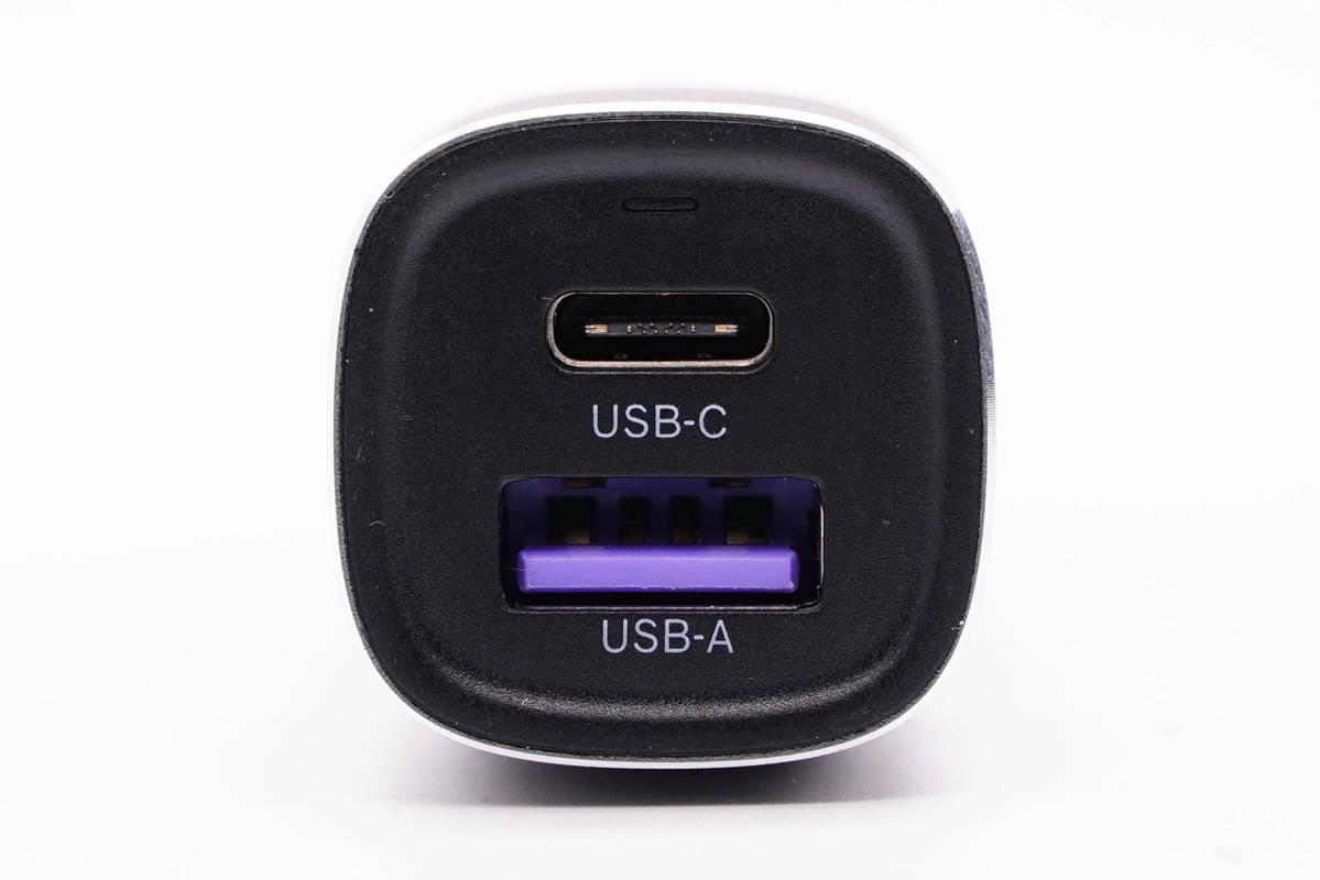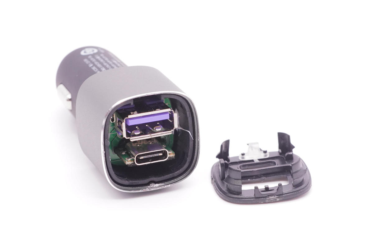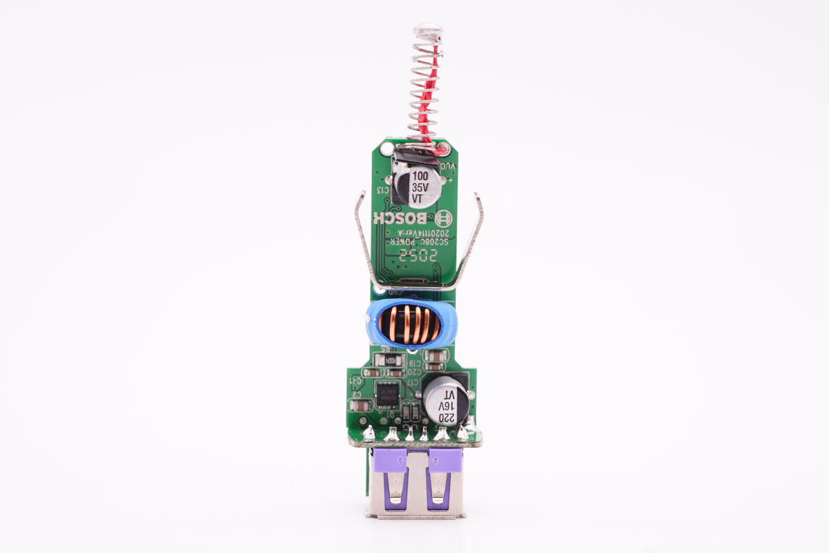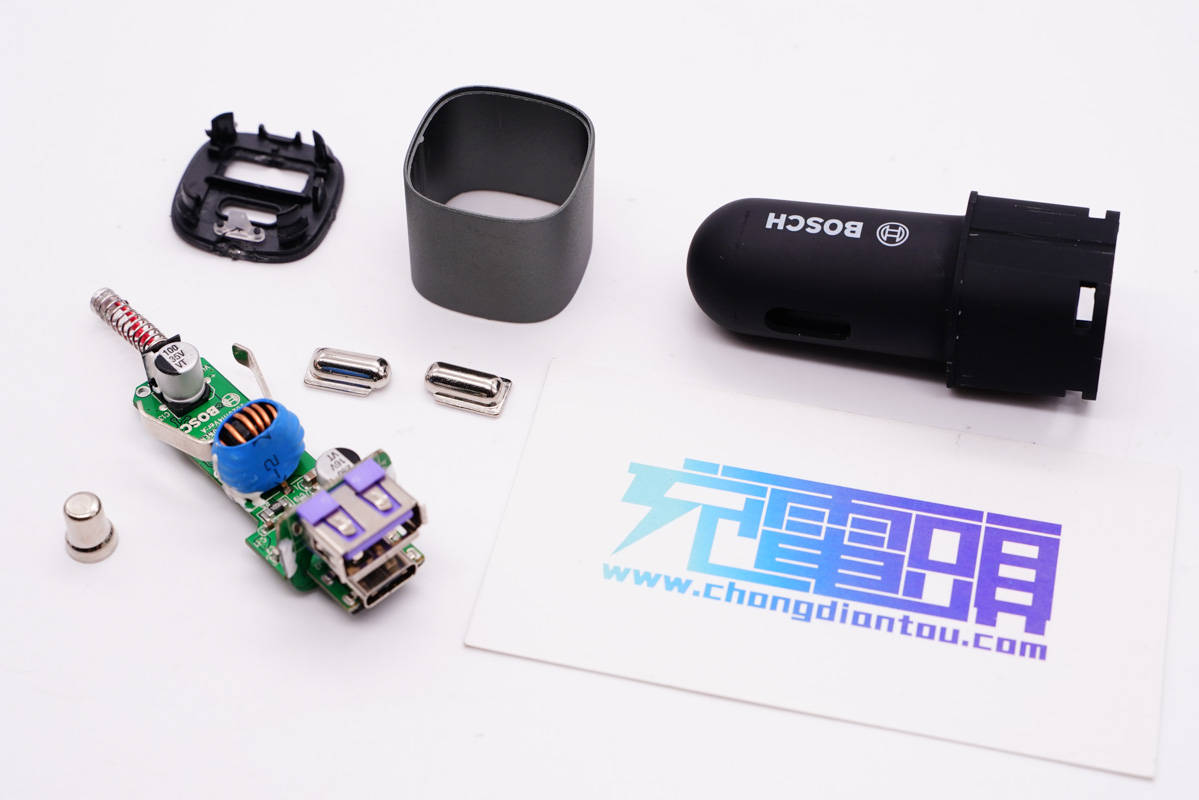 最近充電頭網拿到了BOSCH博世一款車載充電器,產品小巧精致,配備1A1C雙快充接口,其中USB-A口支持45W快充,USB-C口支持30W PD快充,雙口同時輸出,最大功率25W,功率智能分配。下面就對這款車充進行詳細拆解,看看設計做工如何。