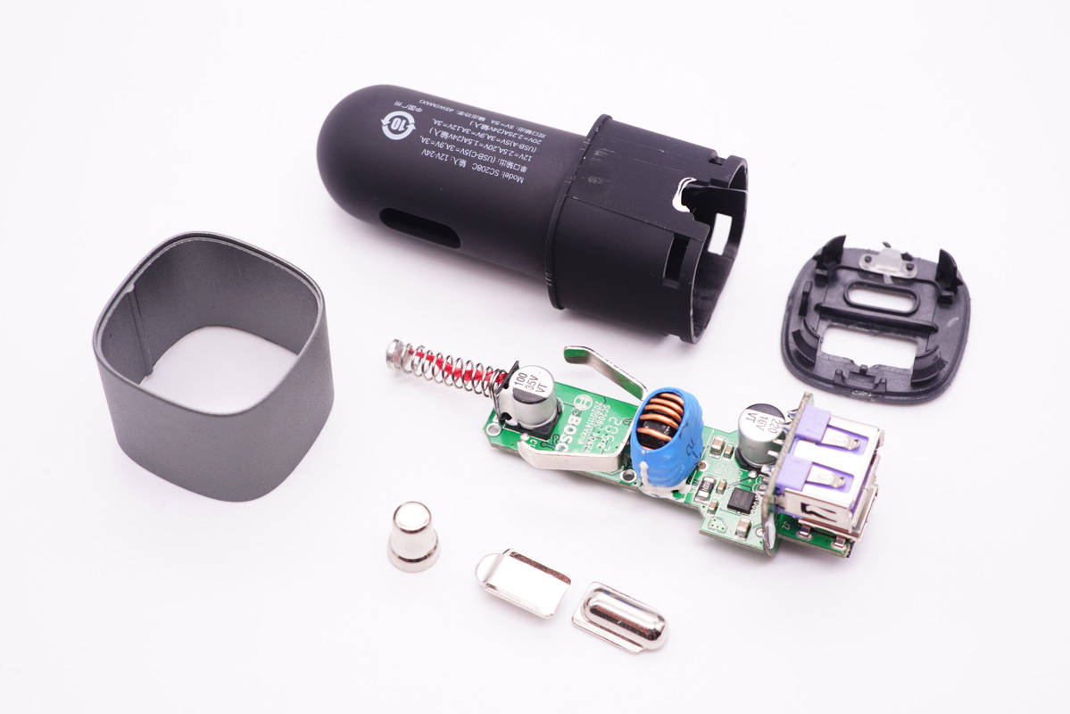 車充頂部塑料殼采用卡扣進行固定封裝。