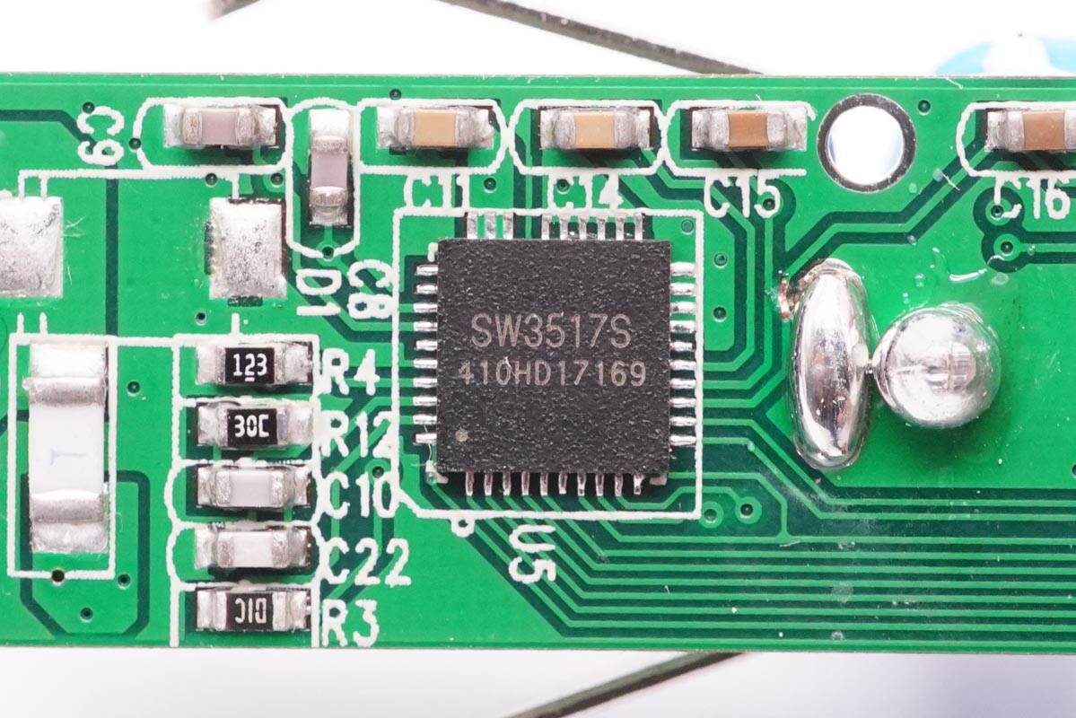 充電頭網通過拆解了解到,車充具有上述強悍性能得益于智融SW3517S快充方案的使用,該芯片集成度非常高,外圍只需少量的器件,即可組成完整的高性能多快充協議雙口充電解決方案。此外車充輸入輸出采用固態電容濾波,每個接口也都配有保護管,設計講究。