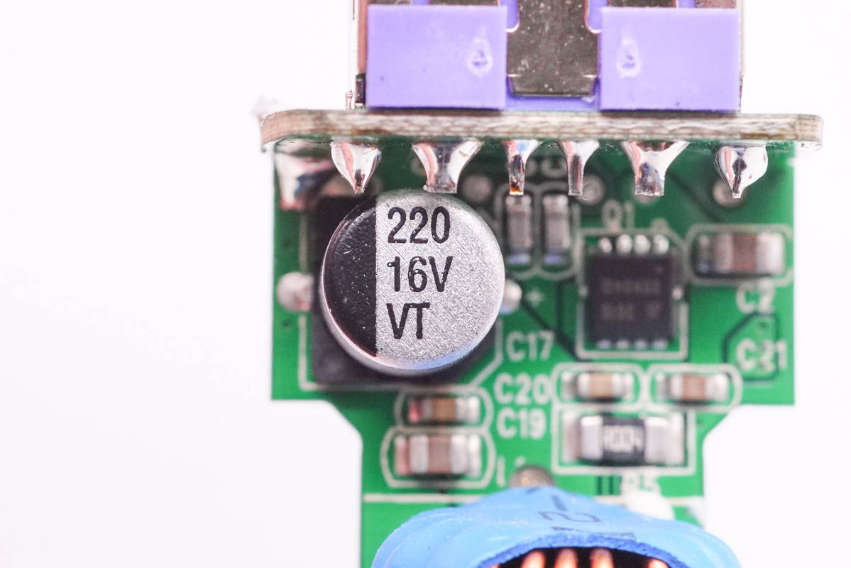 降壓輸出濾波固態電容特寫,規格為16V 220μF。
