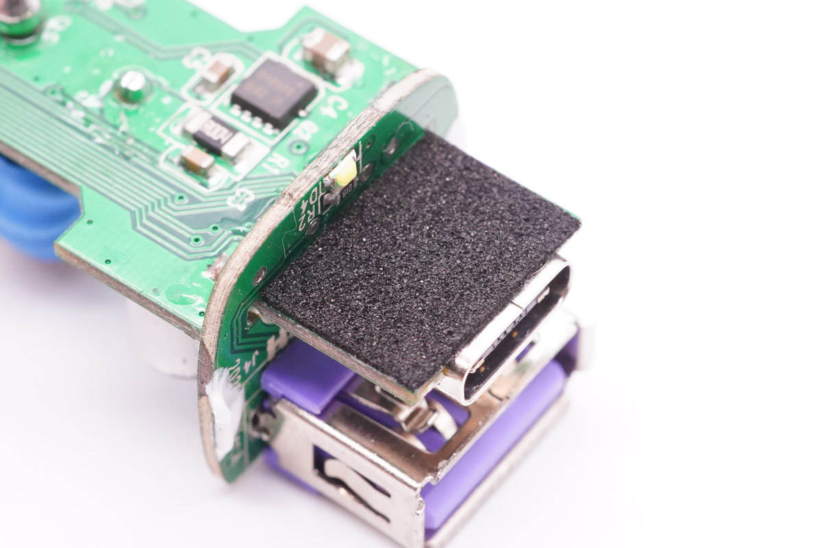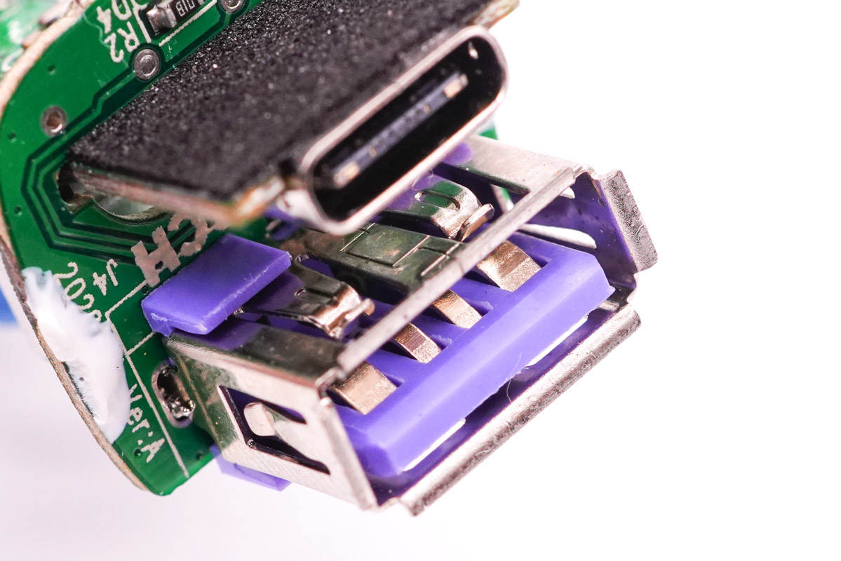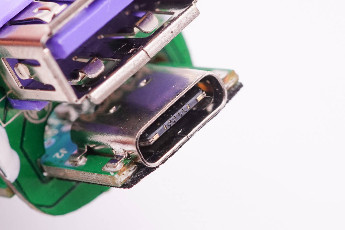 USB-C母座特寫,使用小板垂直焊接,沉板設計。