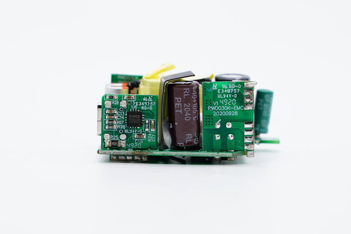 輸出端一覽,同步整流小板右邊是兩顆濾波固態電容,USB-C母座使用協議小板垂直焊接。