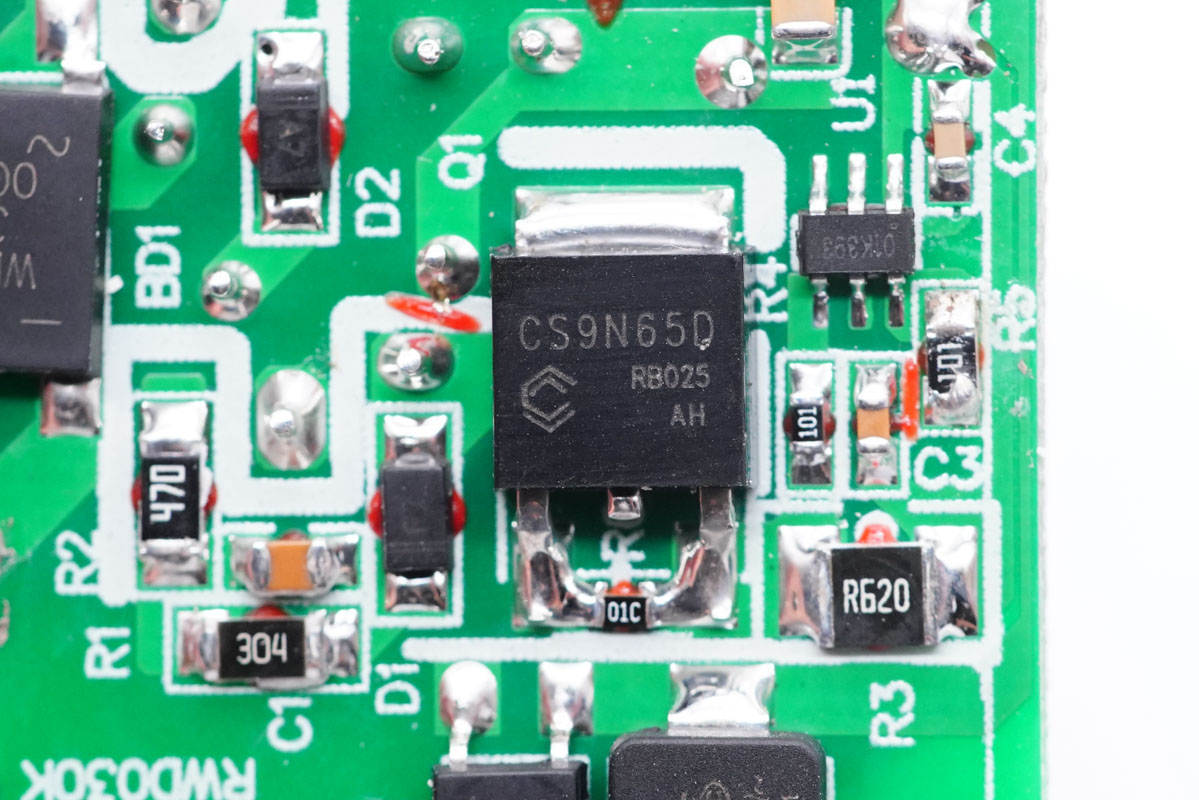 充電頭網通過拆解了解到,除主板外,充電器還設有一塊輸入小板以及兩塊輸出小板,電容、變壓器等器件打膠加固。開關電源部分,次級同步整流控制器采用矽力科技AP402B,性能強悍,可比肩MPS的MP6908,協議芯片采用松翰SNPD1683,進行協議識別控制輸出電壓。采用華容偉業電解電容和固態電容進行輸入輸出濾波。