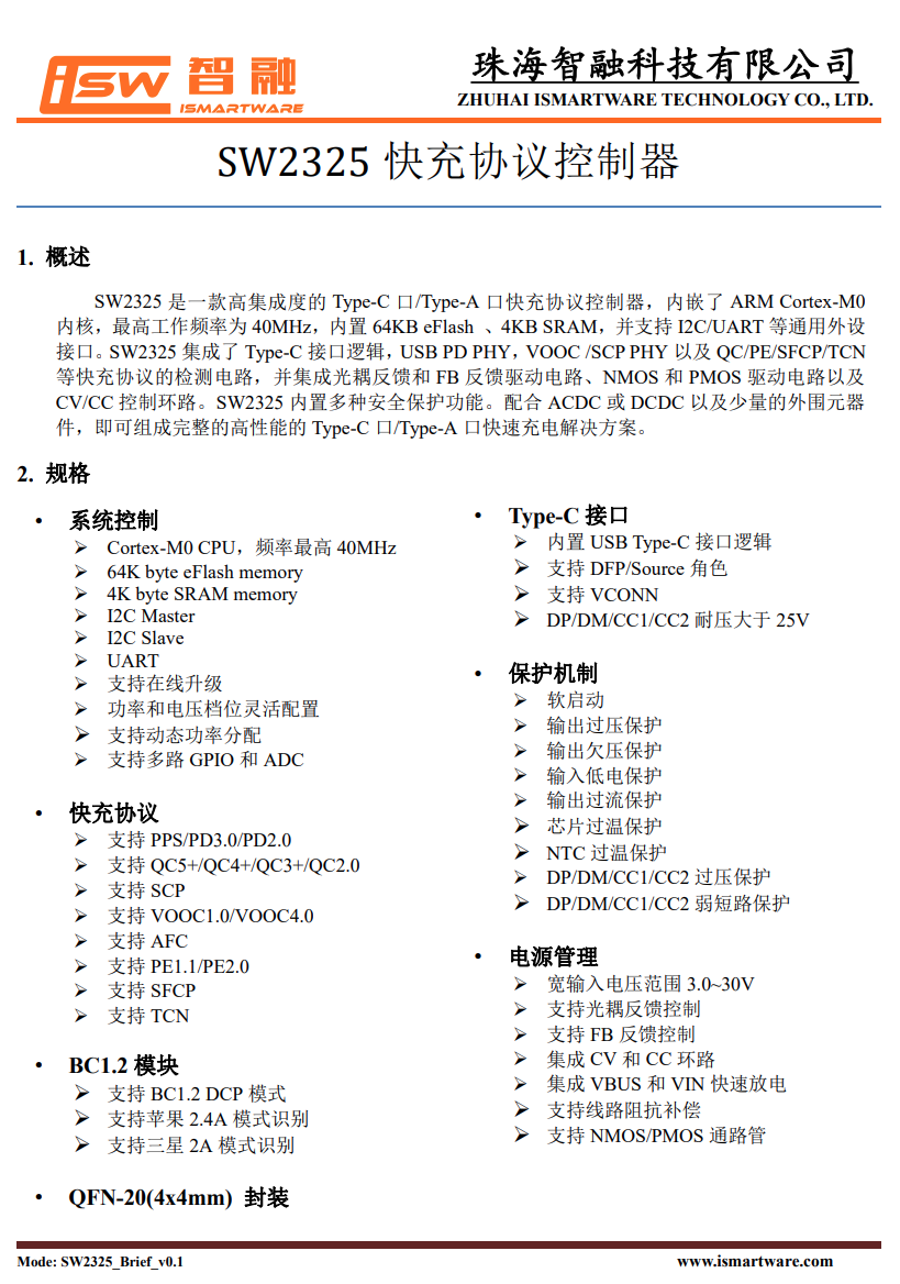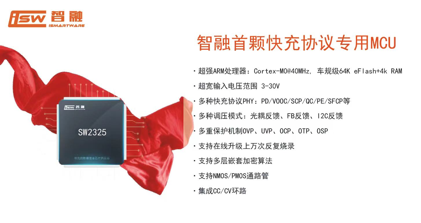 SW2325是智融首顆快充協議專用MCU,內置ARM Cortex-M0處理器,運行頻率40MHz,內置車規級64K eFlash+4K RAM。支持3-30V超寬輸入電壓范圍。支持PD/VOOC/SCP/QC/PE/SFCP等快充協議。支持光耦反饋,FB反饋和I2C反饋三種調壓方式,適配車充,充電器等應用。SW2325支持多重保護功能,支持在線升級,支持多層嵌套加密算法,支持NMOS或PMOS通路管,集成CC/CV環路,功能強大且全面。