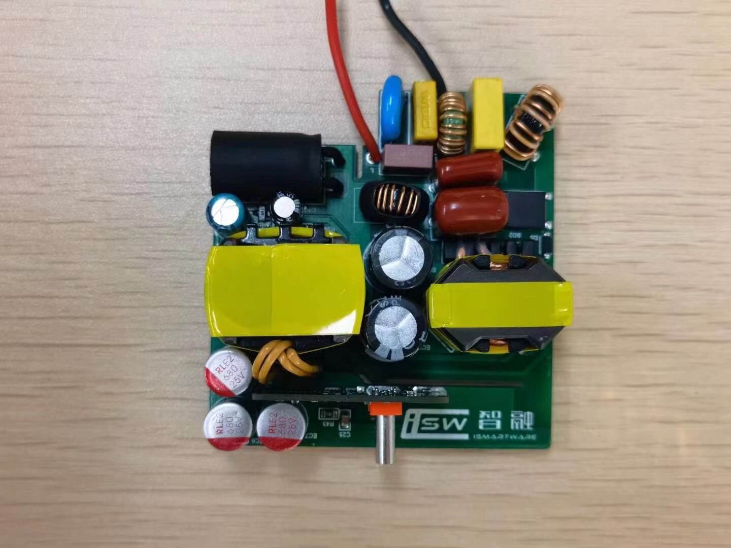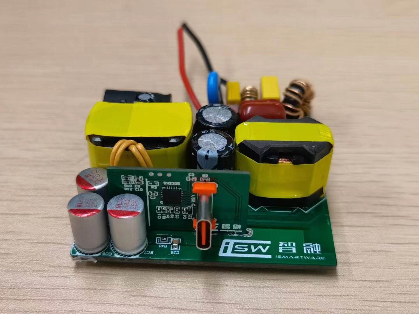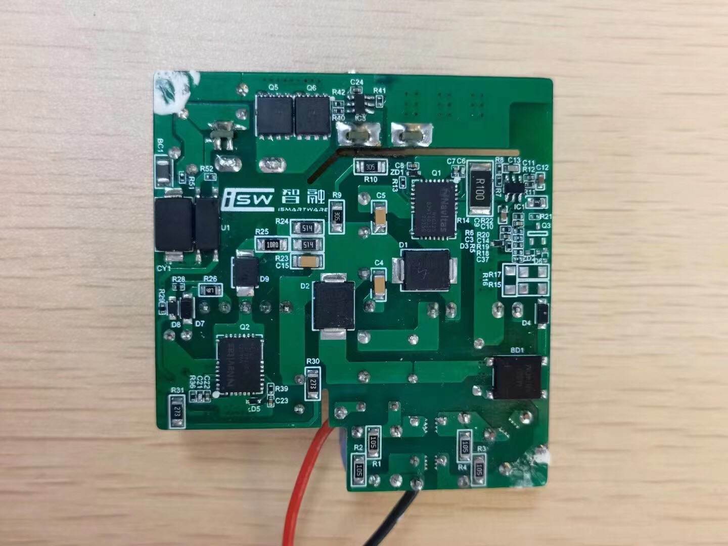 智融SW2325的百瓦參考設計采用PFC+反激的開關電源架構,左側是開關變壓器,右側是PFC升壓電感,輸出采用三顆固態電容并聯濾波。