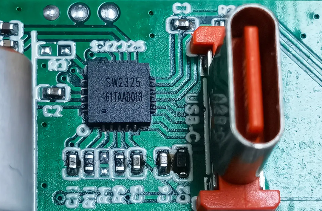 智融SW2325協議芯片特寫,采用QFN4*4-20封裝,體積小巧外圍元件精簡。
