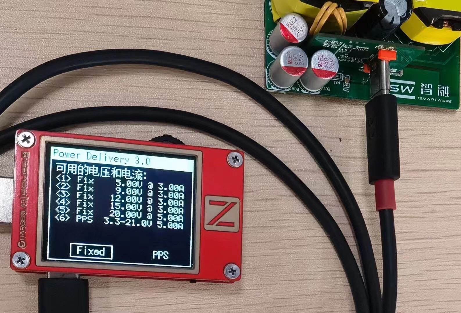 讀取充電器的PDO報文,充電器支持5V3A、9V3A、12V3A、15V3A、20V5A五個固定電壓檔位,和一組3.3-21V5A PPS快充協議。