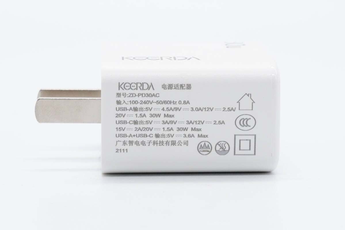 充電器采用直板造型設計,機身殼表面磨砂處理,邊角過渡圓潤,上手體驗感好。機身上 印有 智電電子(KEERDA)品牌和30W字樣。