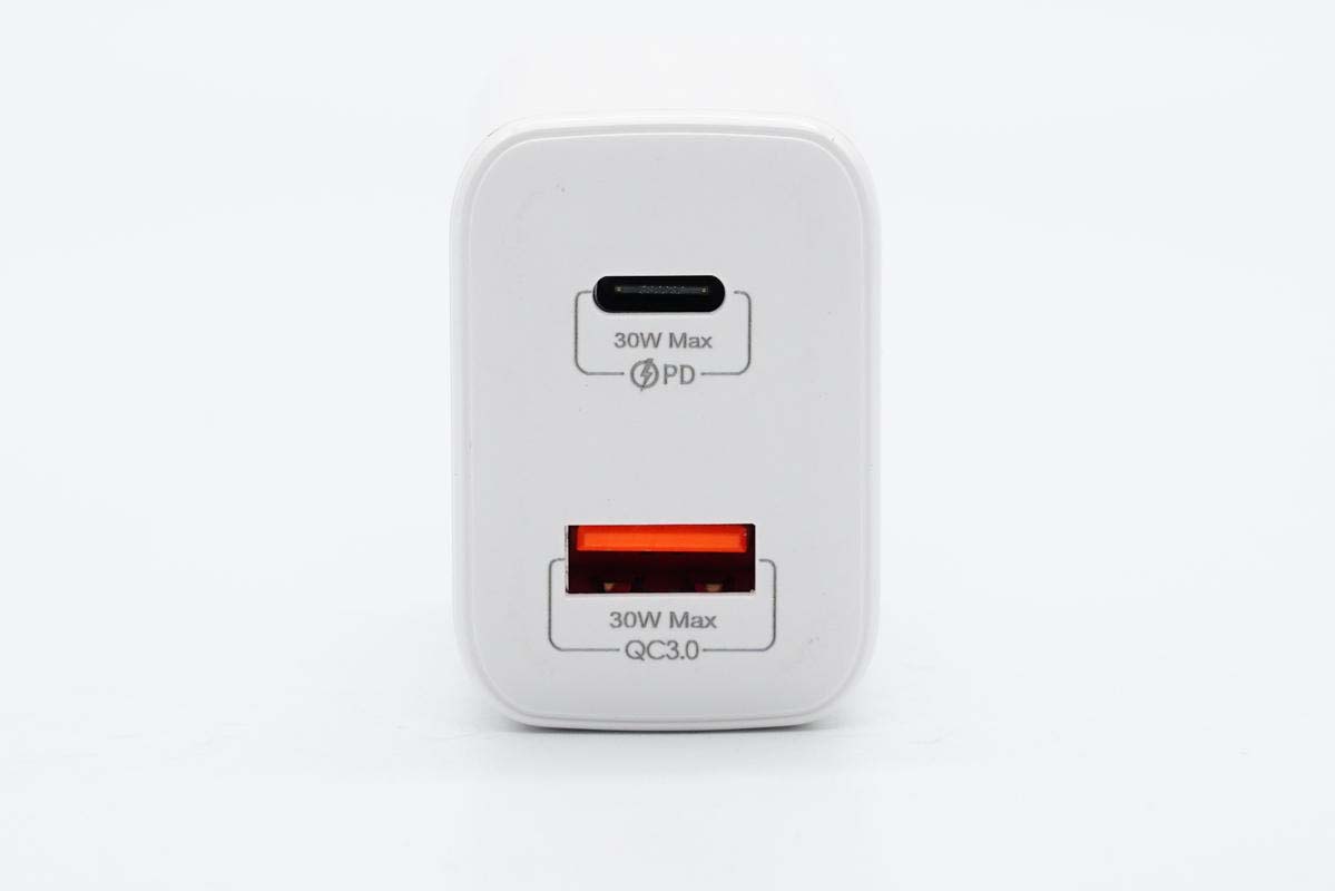 USB-C口黑色膠芯不露銅,USB-A口橘紅色膠芯,雙口均支持最大30W快充輸出。