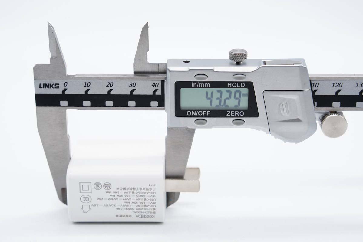 使用游標卡尺實測充電器機身長度為43.29mm。