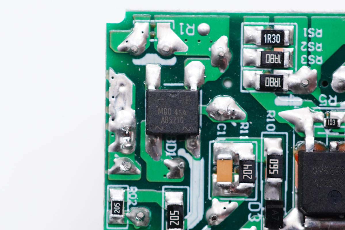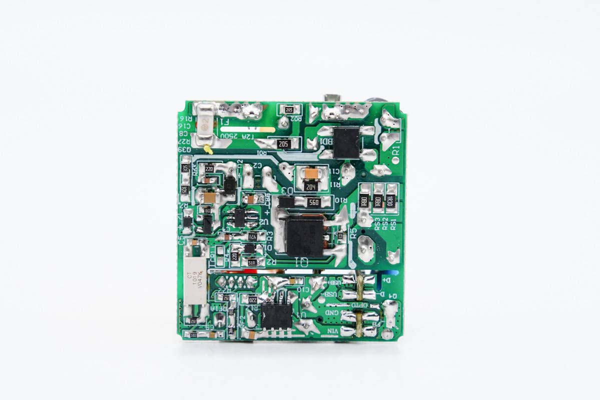 主板背面設有白色貼片保險絲、整流橋、PWM主控芯片、初級開關MOS管、白色光耦和次級同步整流芯片。